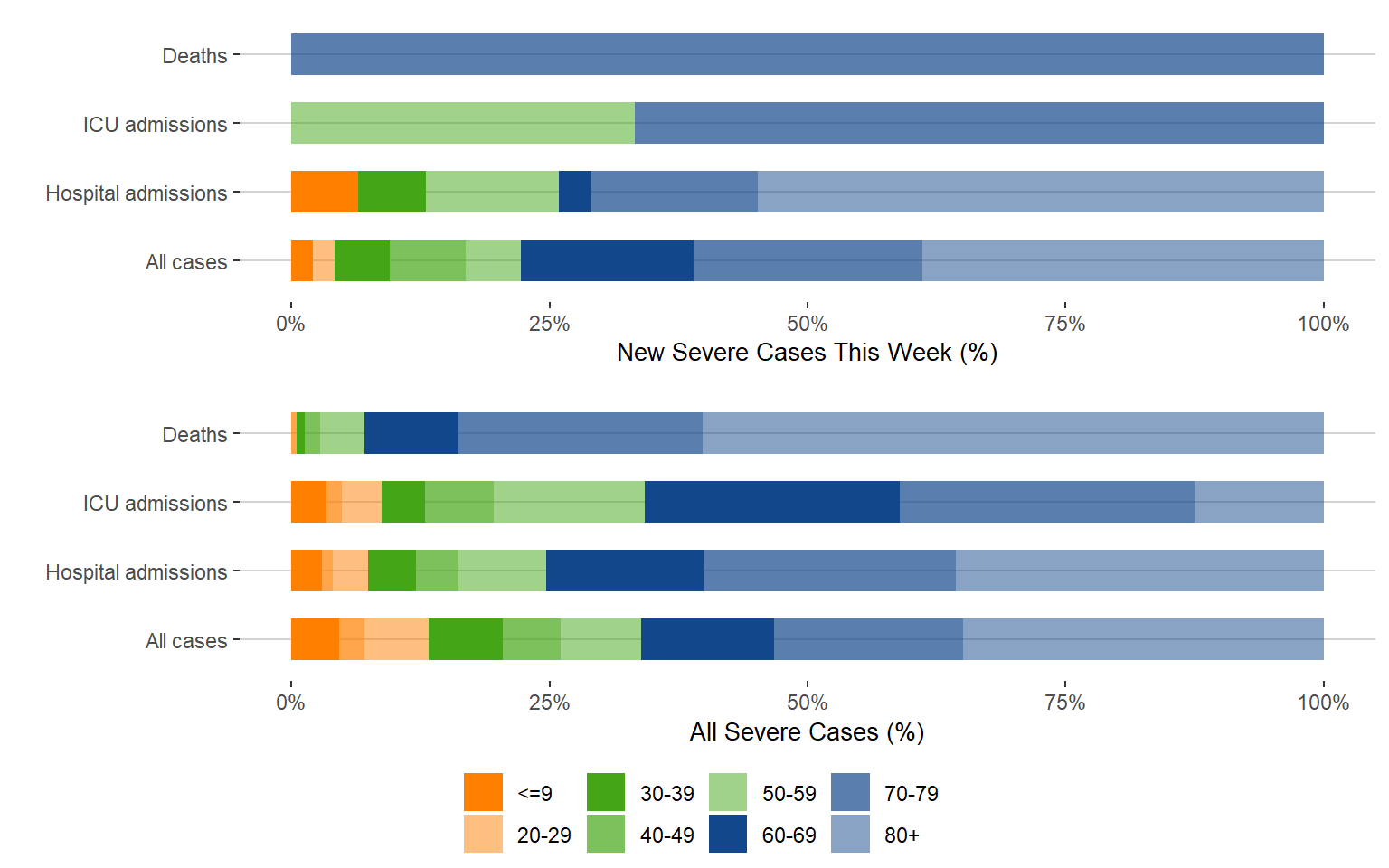 Figure 7. Age Distribution of Severe COVID-19 Cases This Week Compared to All Cases, Manitoba, July 3, 2022 – April 29, 2023
