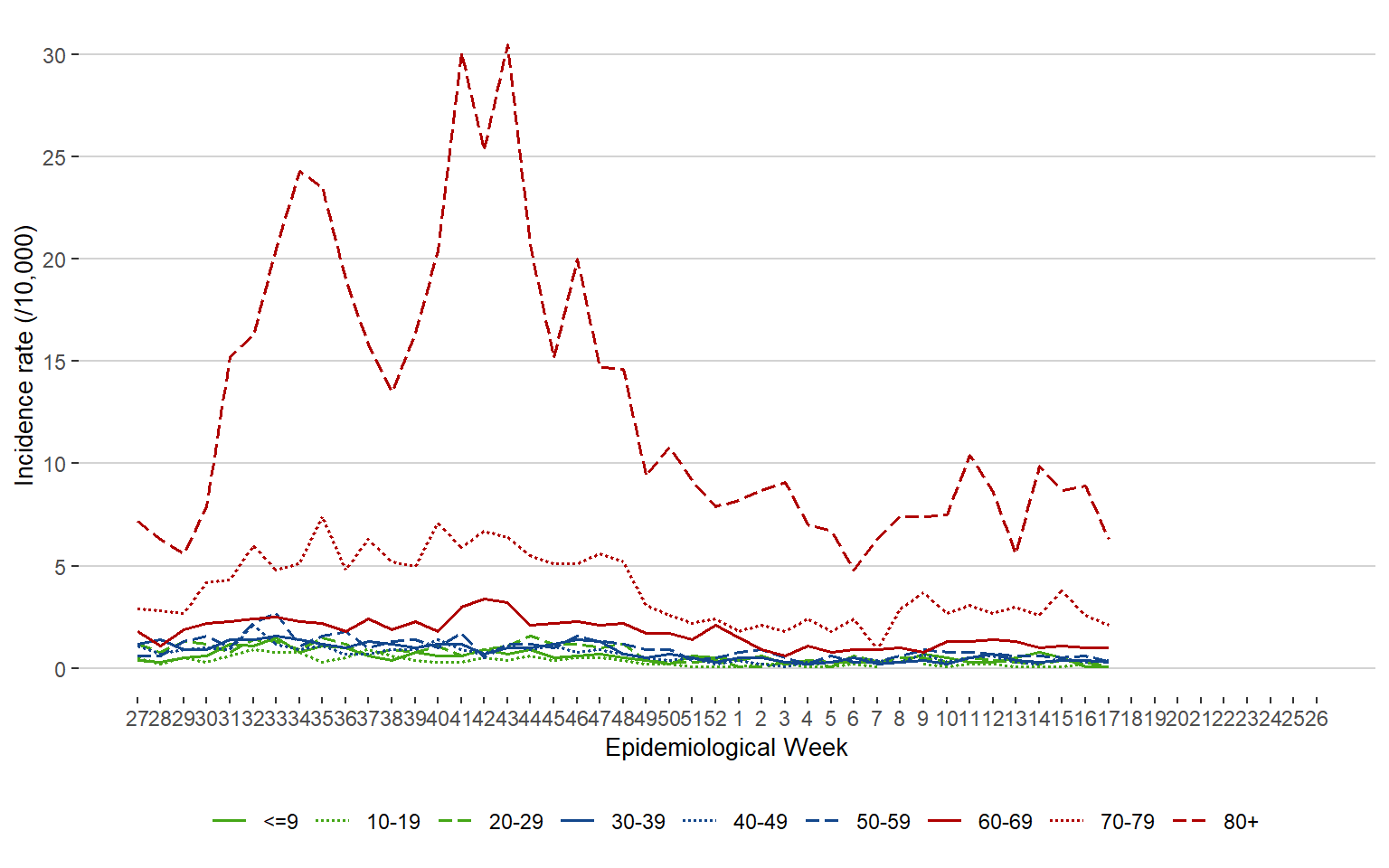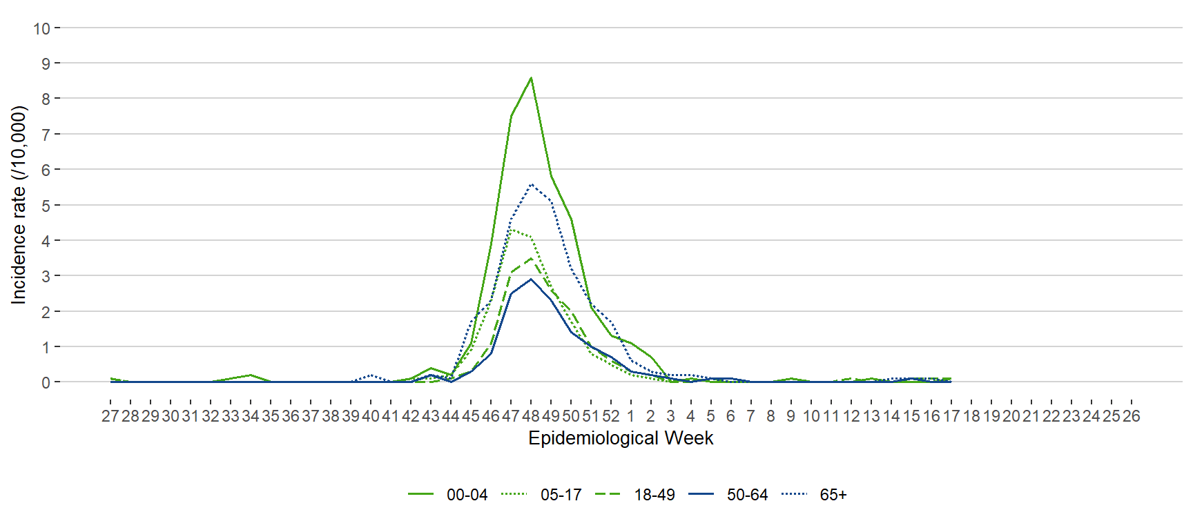 Figure 10. Incidence Rate (/10,000 Population) of Influenza Cases by Age Group and Week of Public Health Report Date, July 3, 2022 – April 29, 2023