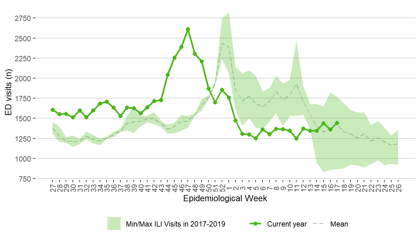 Figure 19. Weekly Respiratory Visits to Emergency Department, Manitoba, 2017 – April 29, 2023