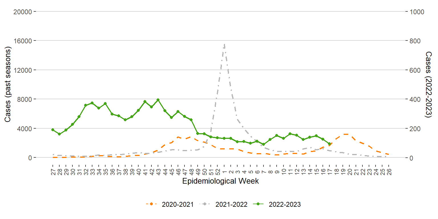 Figure 9. Weekly Cases of Influenza by Season, Manitoba, 2019 – 2023 (July through June)