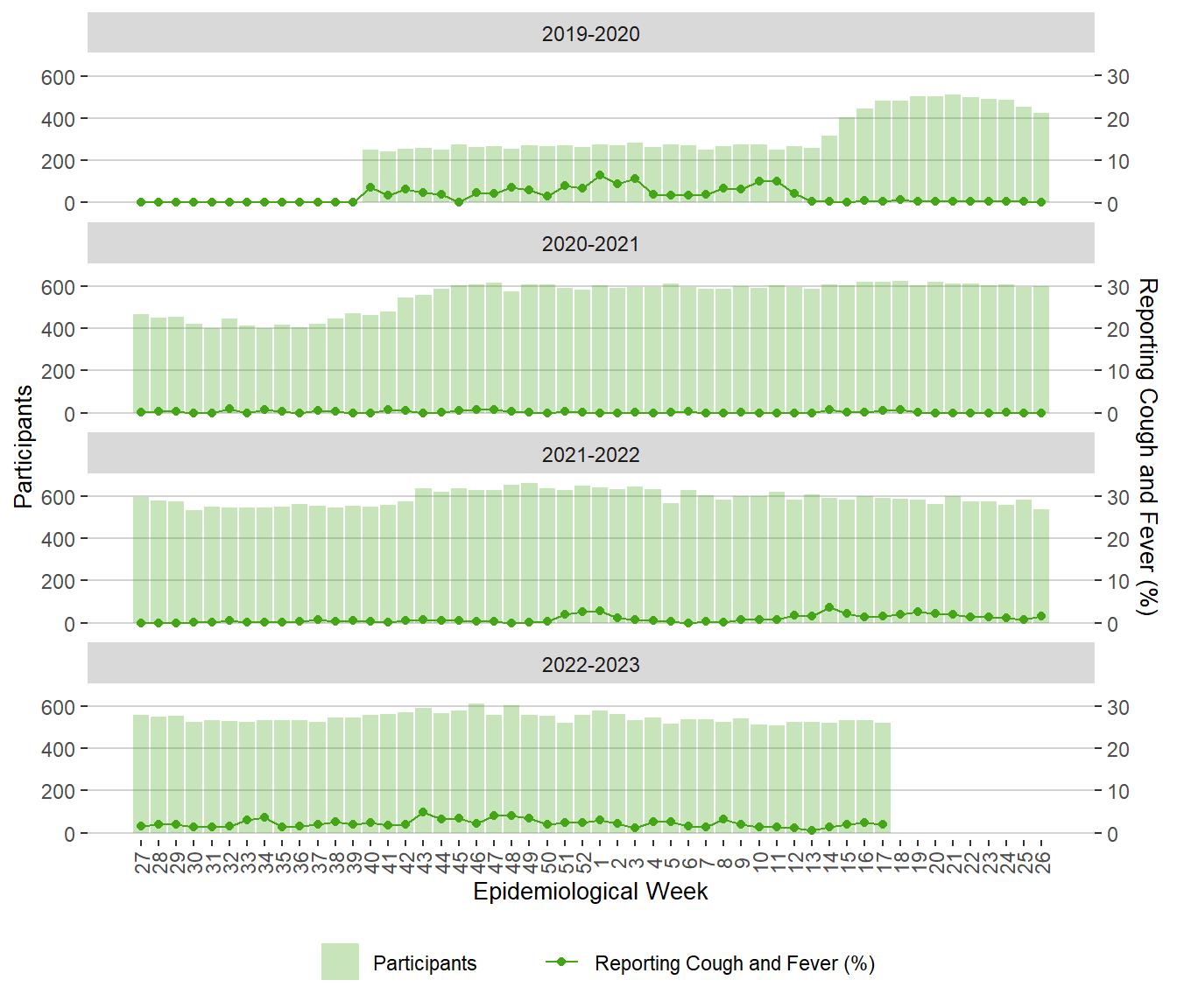 Figure 16. Weekly FluWatchers Participants and Percentage Reporting Fever and Cough, Manitoba, 2019 – April 29, 2023