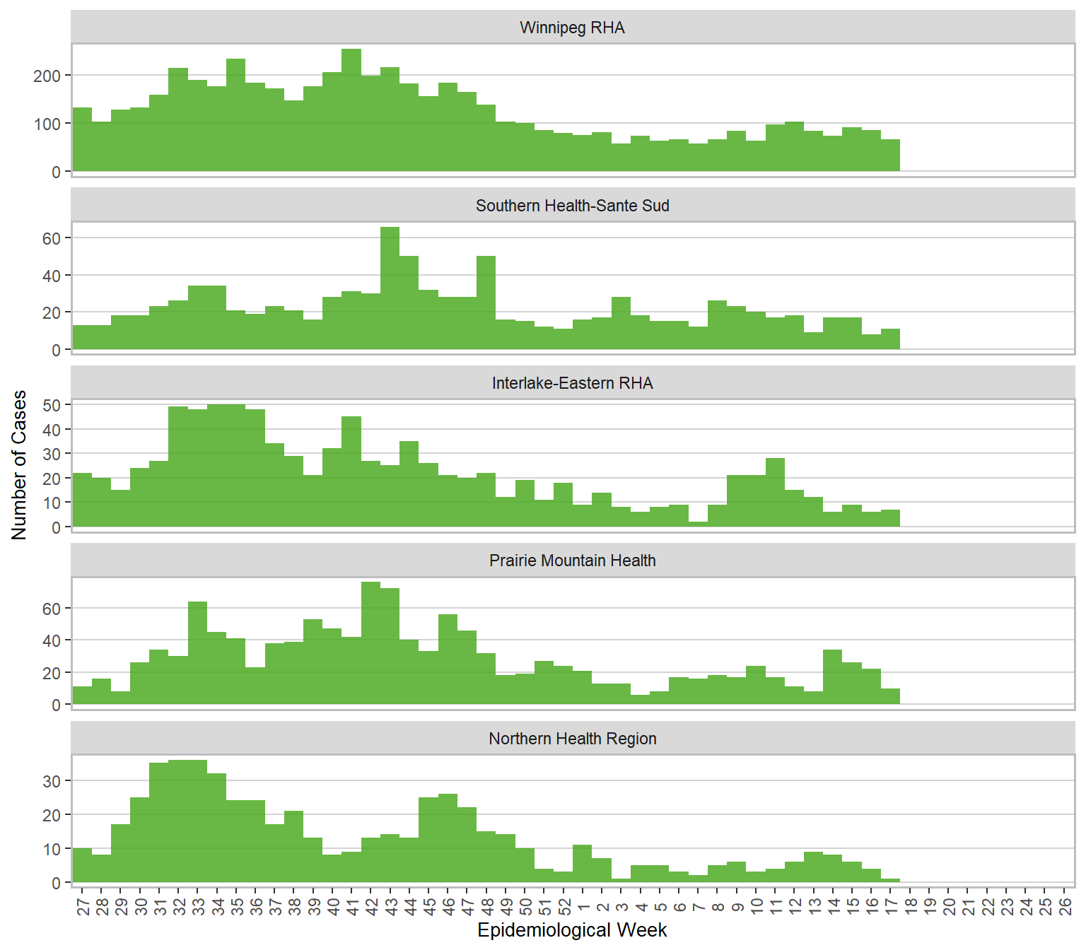 Figure 4. Cases of COVID-19 by Health Region and Public Health Report Date, Manitoba, July 3, 2022 – April 29, 2023