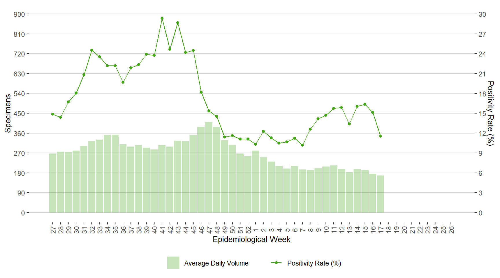 BackFigure 11. Average Daily Testing Volume and Positivity (%) for Influenza by Week of Specimen Receiving Date, Manitoba, July 3, 2022 – April 29, 2023