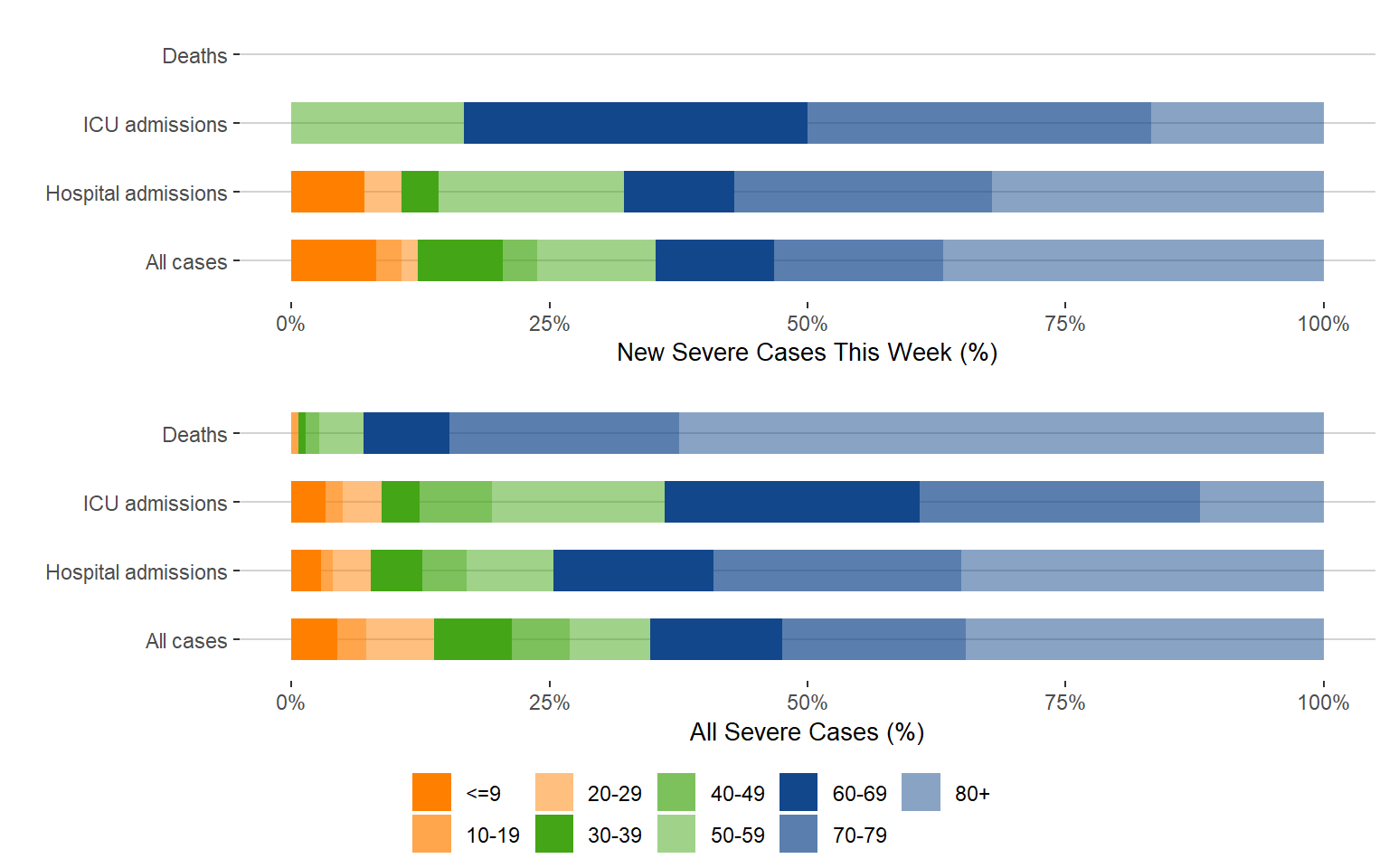 Figure 7. Age Distribution of Severe COVID-19 Cases This Week Compared to All Cases, Manitoba, July 3, 2022 – January 14, 2022