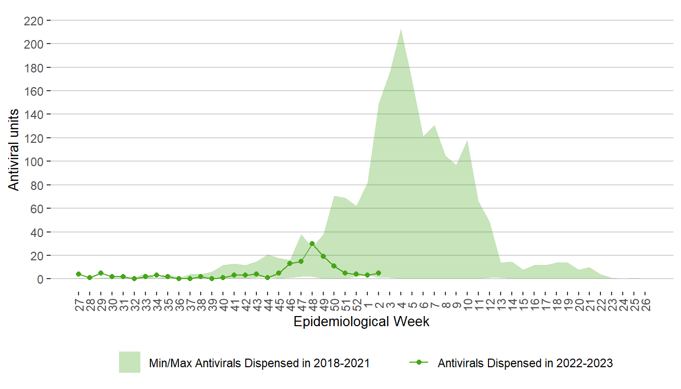 Figure 18. Weekly Units of Antiviral Dispensed from Pharmacies, Manitoba, 2018 – January 14, 2022