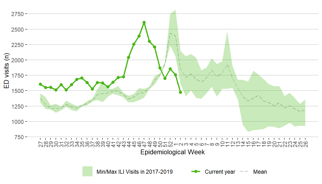 Figure 19. Weekly Respiratory Visits to Emergency Department, Manitoba, 2017 – January 14, 2022