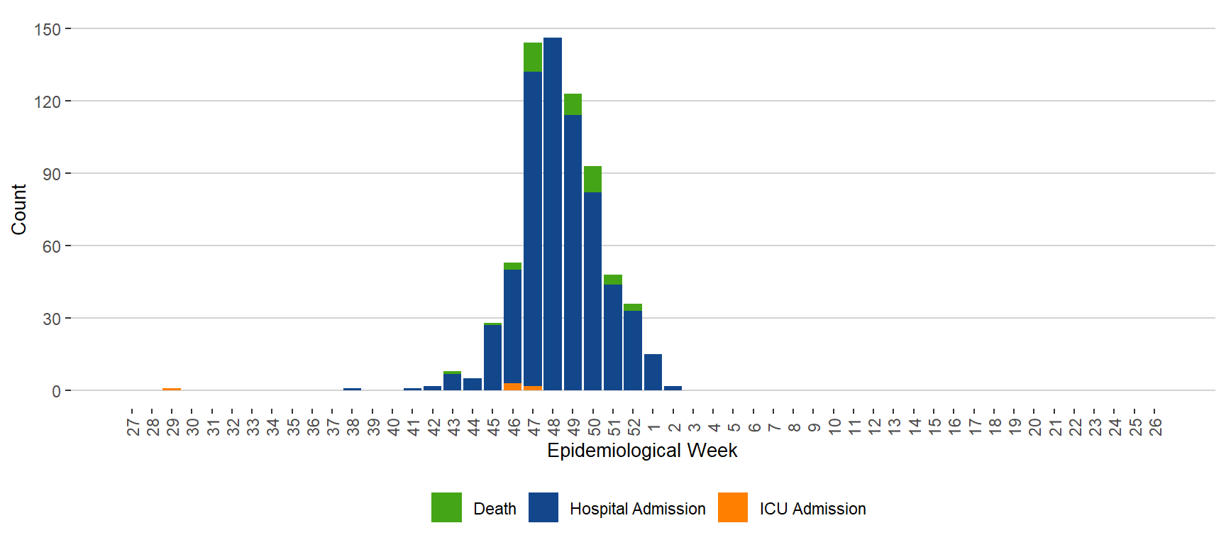 BackFigure 13. Severe Outcomes of Influenza by Week of Outcome Date, Manitoba, July 3, 2022 – January 14, 2022