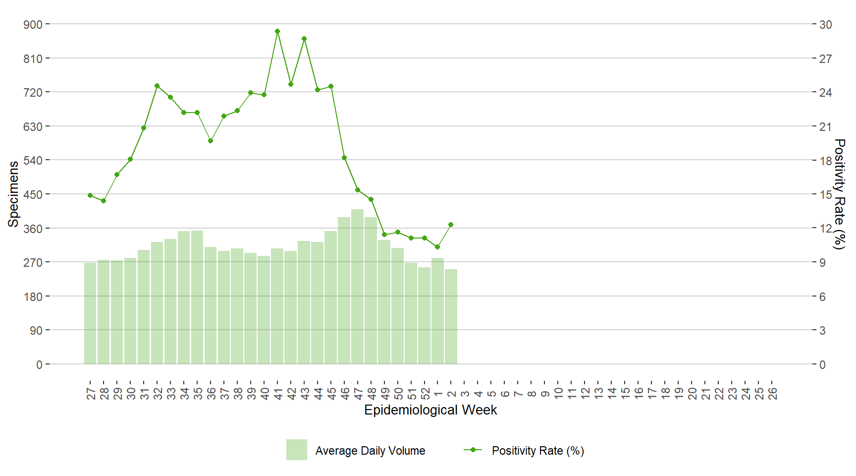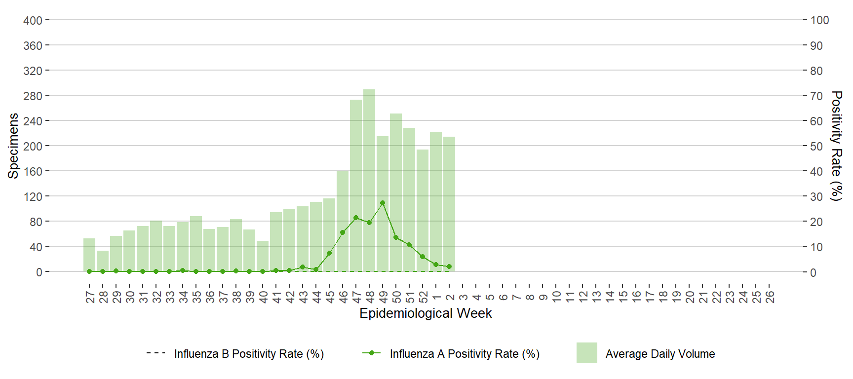 BackFigure 11. Average Daily Testing Volume and Positivity (%) for Influenza by Week of Specimen Receiving Date, Manitoba, July 3, 2022 – January 14, 2022