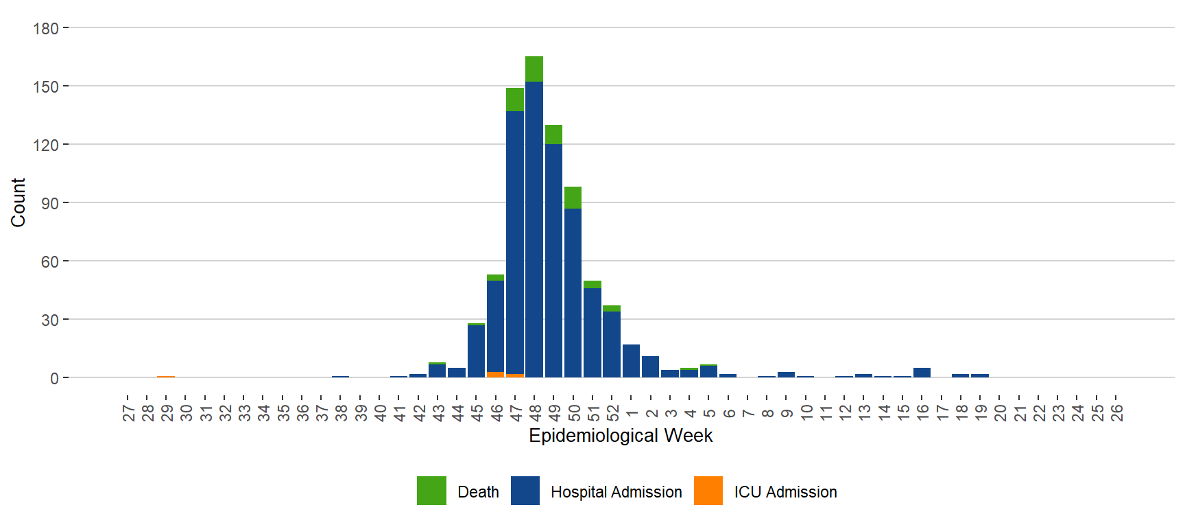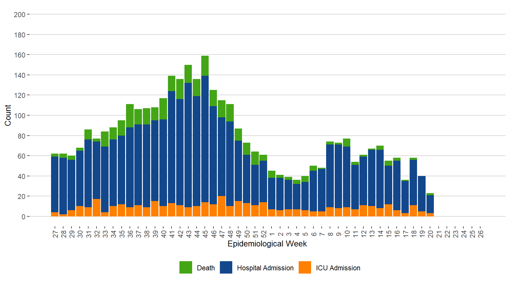BackFigure 13. Severe Outcomes of Influenza by Week of Outcome Date, Manitoba, July 3, 2022 – May 20, 2023