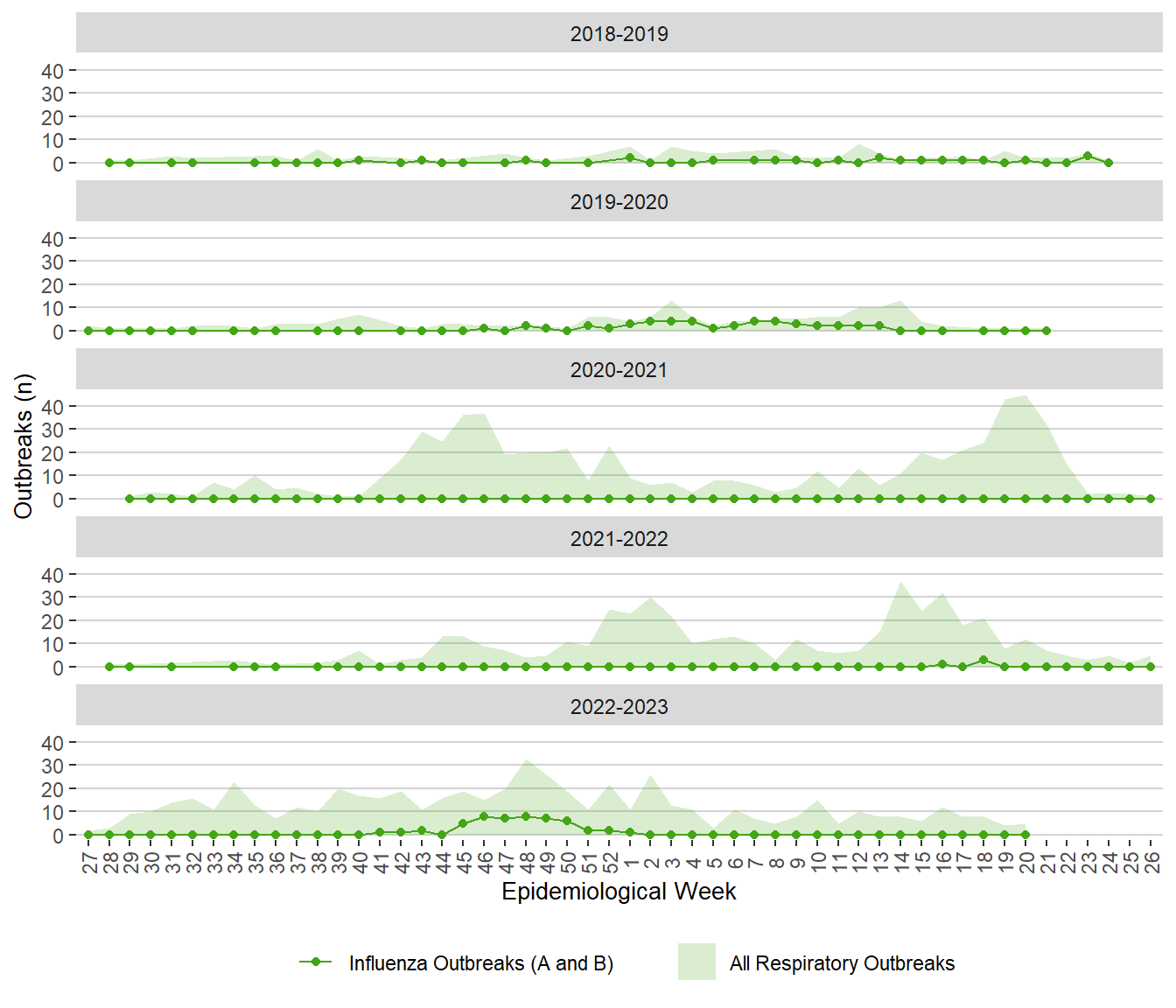 Note: All respiratory outbreaks include COVID-19 outbreaks, influenza outbreaks and the other respiratory outbreaks with known or unknown pathogens.