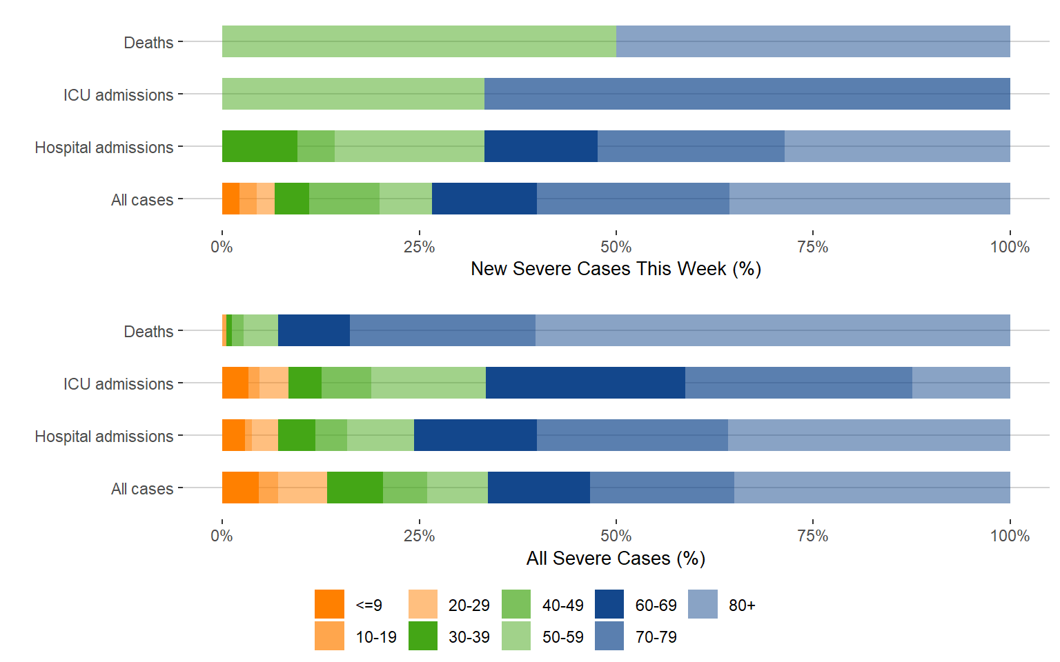 Figure 7. Age Distribution of Severe COVID-19 Cases This Week Compared to All Cases, Manitoba, July 3, 2022 – May 20, 2023