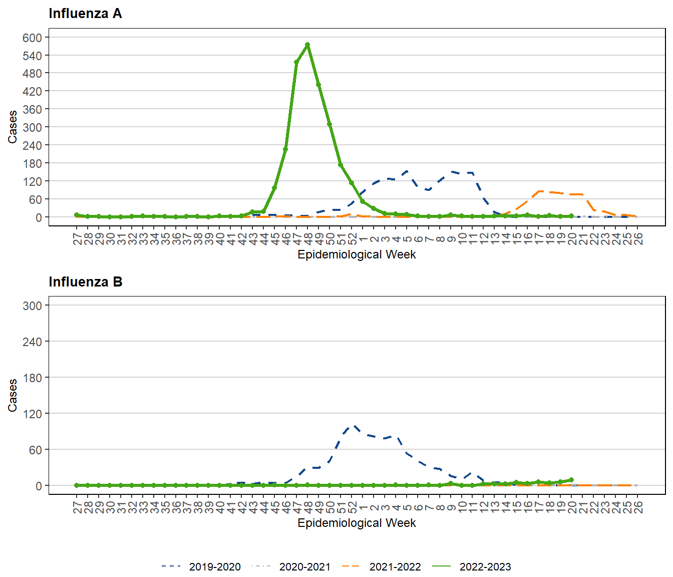 Figure 9. Weekly Cases of Influenza by Season, Manitoba, 2019 – 2023 (July through June)