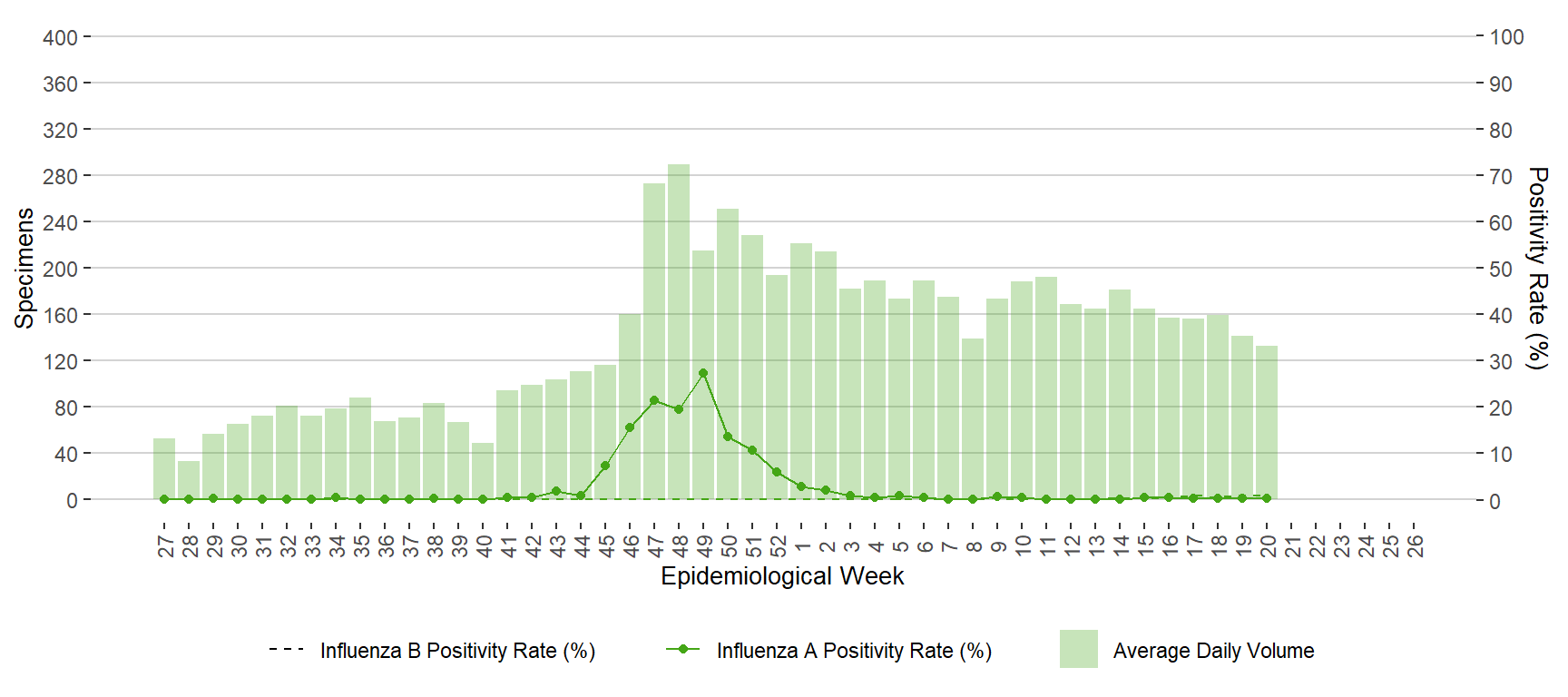 BackFigure 11. Average Daily Testing Volume and Positivity (%) for Influenza by Week of Specimen Receiving Date, Manitoba, July 3, 2022 – May 20, 2023