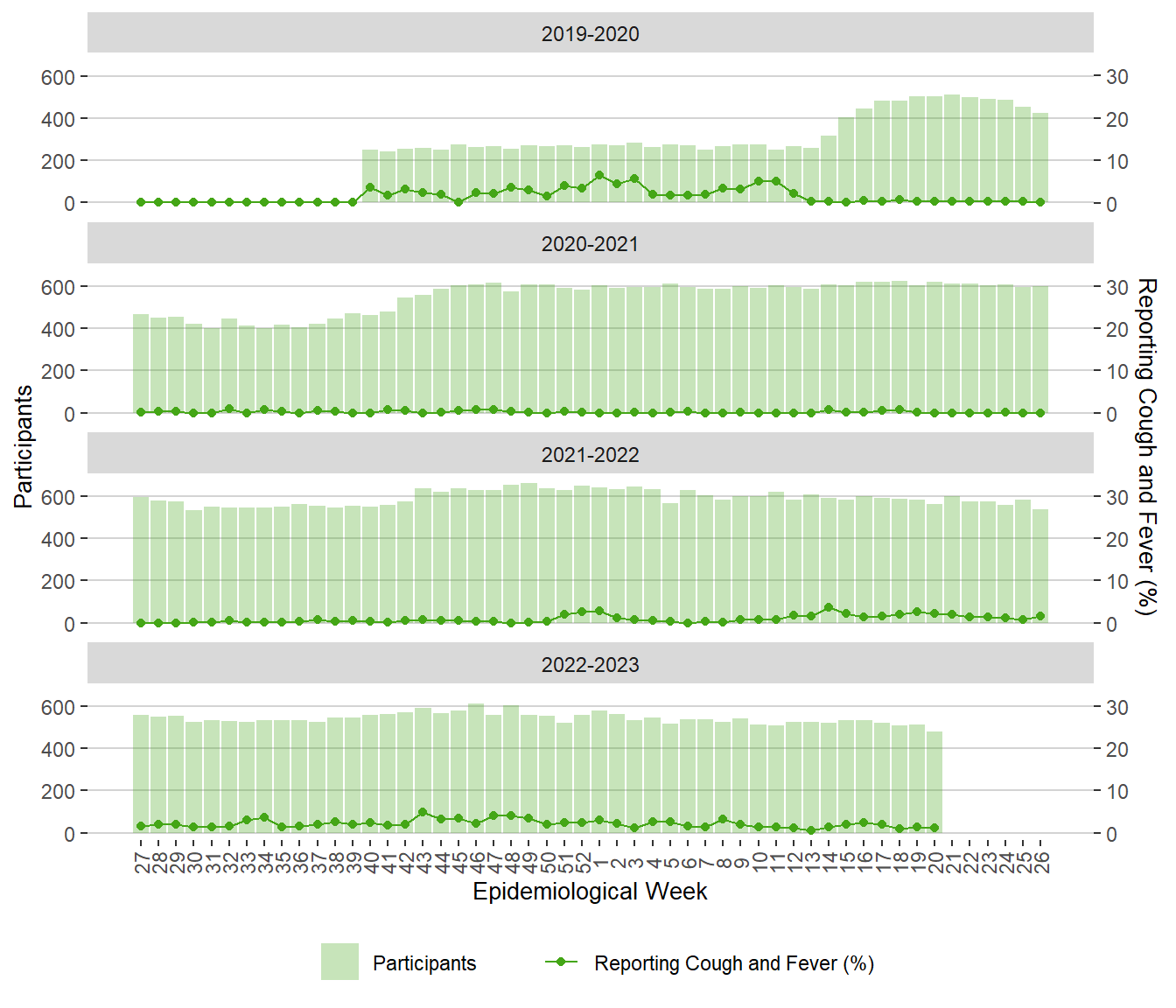 Figure 16. Weekly FluWatchers Participants and Percentage Reporting Fever and Cough, Manitoba, 2019 – May 20, 2023