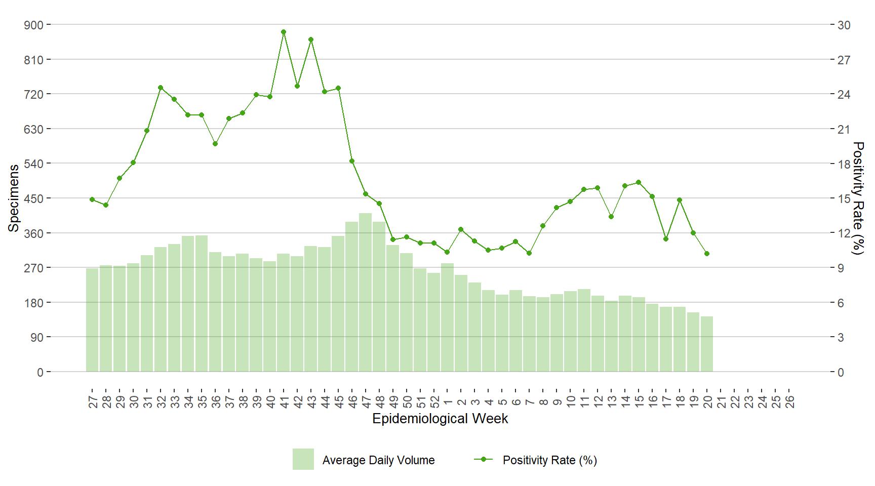 Figure 5. Average Daily Testing Volume and Positivity (%) for COVID-19 by Week of Specimen Receiving Date, Manitoba, July 3, 2022 – May 20, 2023