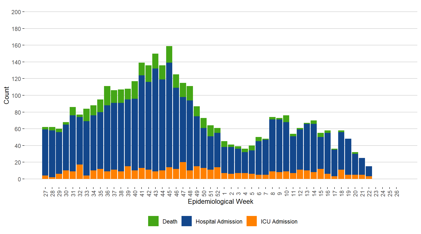BackFigure 13. Severe Outcomes of Influenza by Week of Outcome Date, Manitoba, July 3, 2022 – June 3, 2023