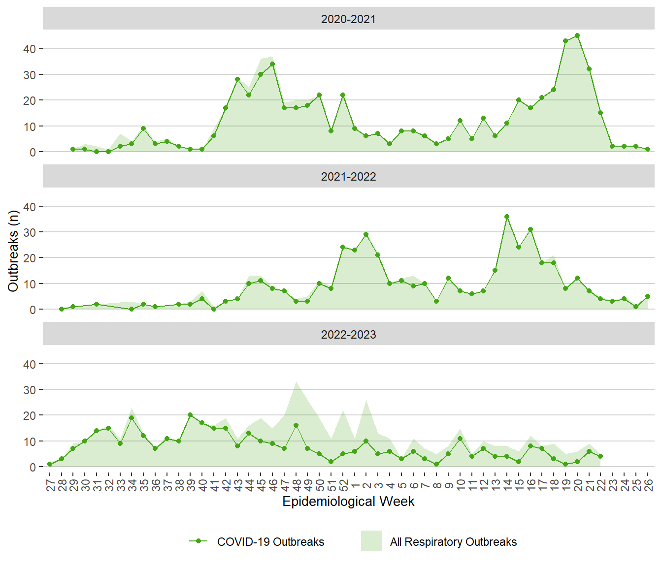 Note: All respiratory outbreaks include COVID-19 outbreaks, influenza outbreaks and the other respiratory outbreaks with known or unknown pathogens.