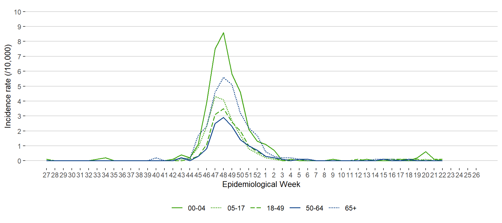 Figure 10. Incidence Rate (/10,000 Population) of Influenza Cases by Age Group and Week of Public Health Report Date, July 3, 2022 – June 3, 2023