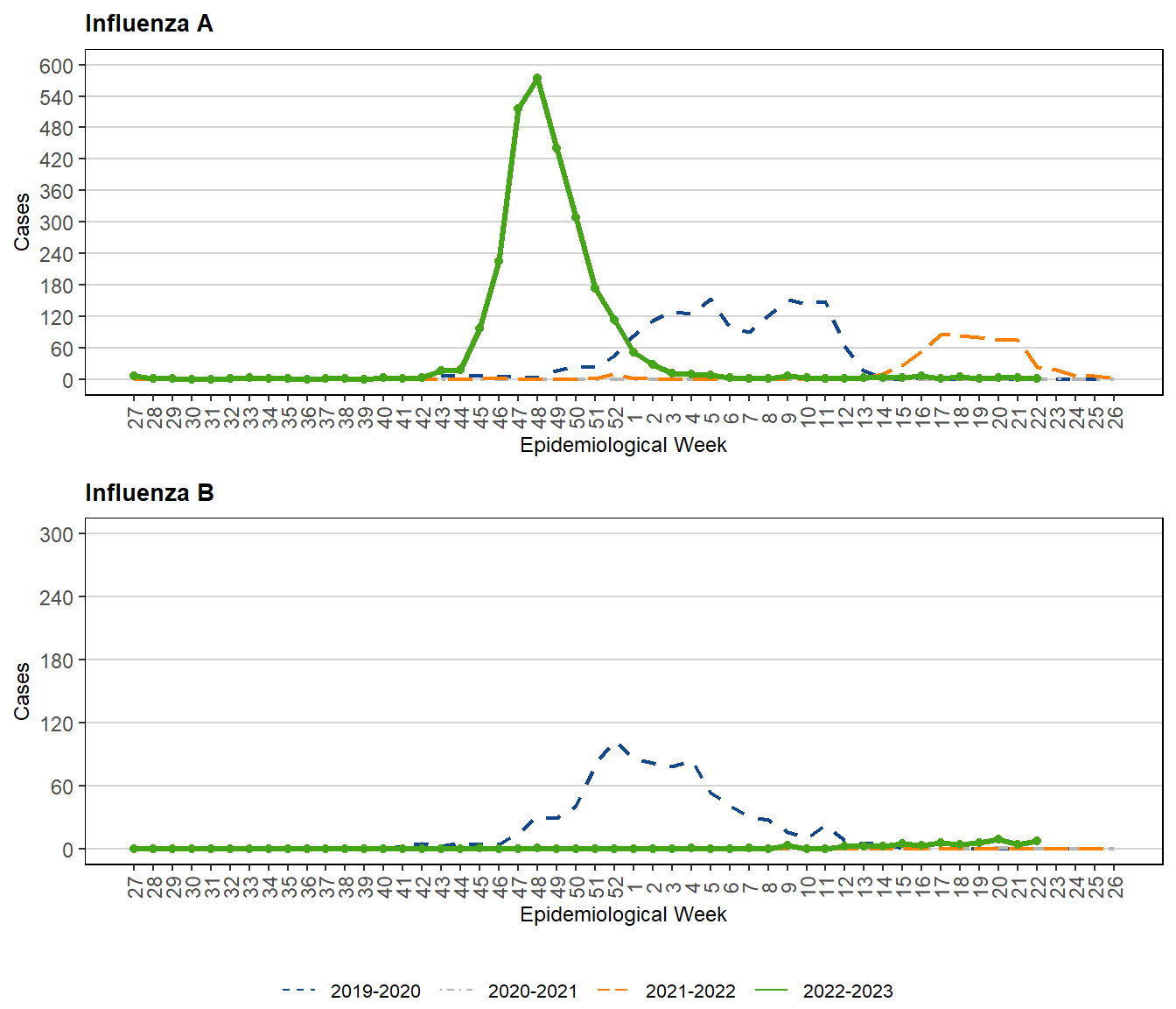 Figure 9. Weekly Cases of Influenza by Season, Manitoba, 2019 – 2023 (July through June)