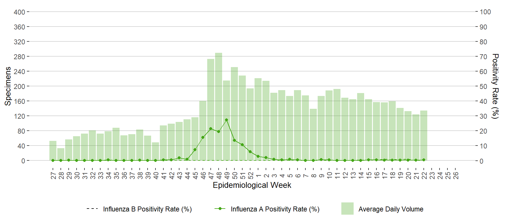 BackFigure 11. Average Daily Testing Volume and Positivity (%) for Influenza by Week of Specimen Receiving Date, Manitoba, July 3, 2022 – June 3, 2023