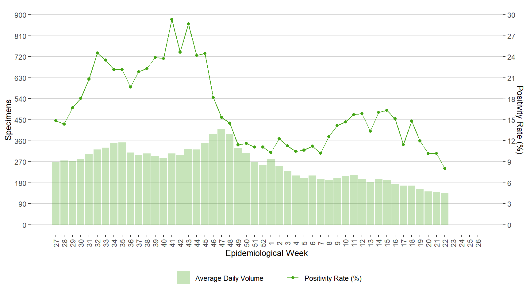 Figure 5. Average Daily Testing Volume and Positivity (%) for COVID-19 by Week of Specimen Receiving Date, Manitoba, July 3, 2022 – June 3, 2023