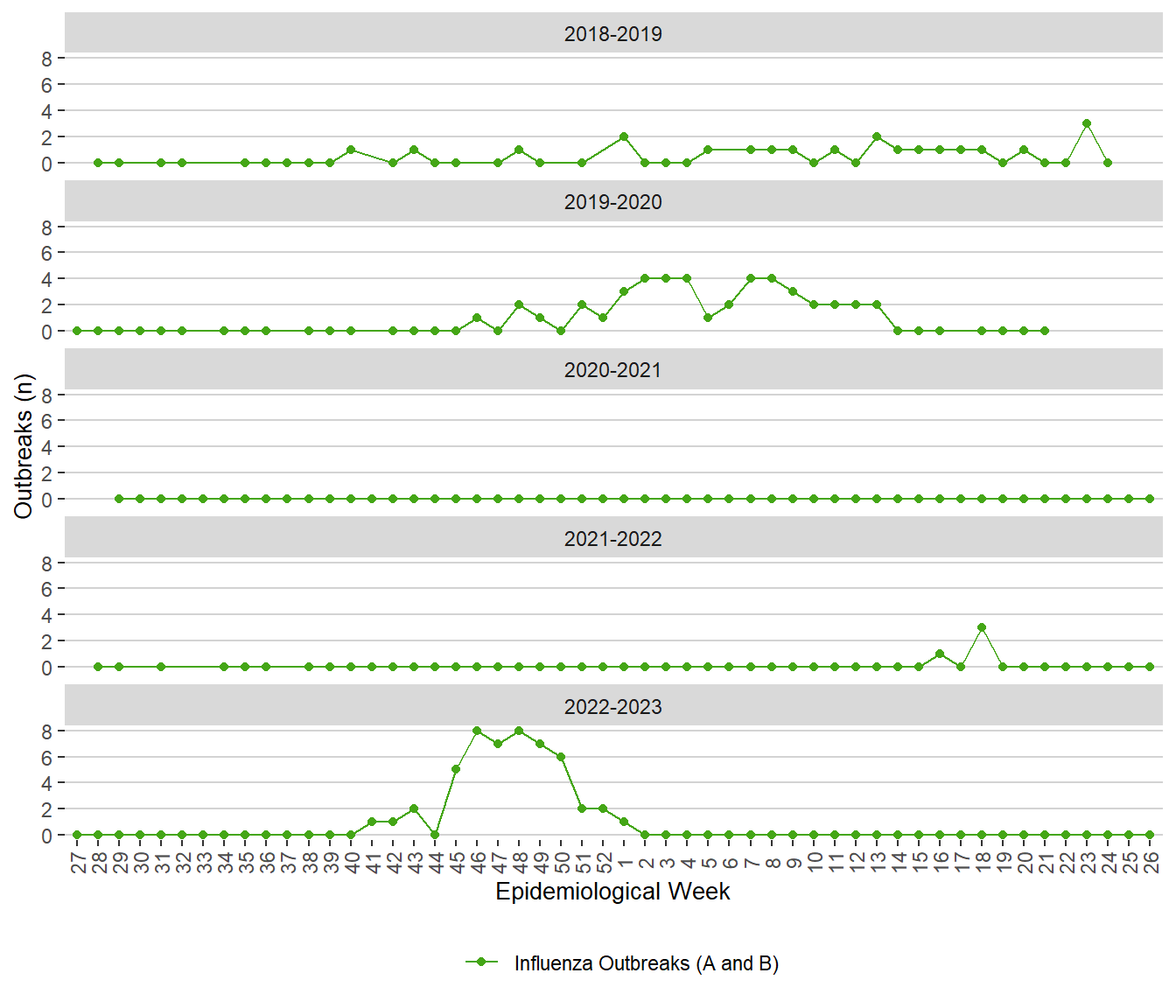 Note: All respiratory outbreaks include COVID-19 outbreaks, influenza outbreaks and the other respiratory outbreaks with known or unknown pathogens.