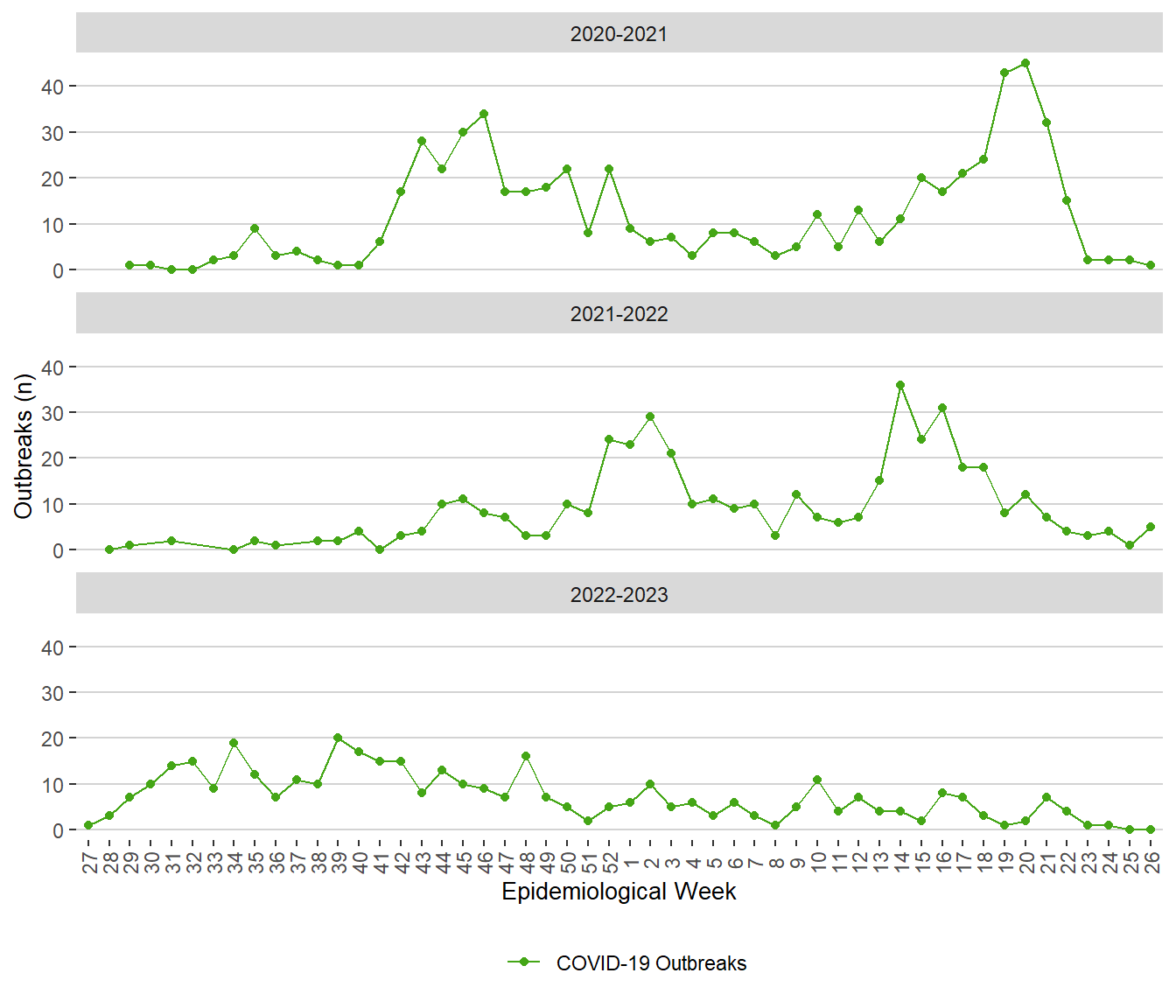 Figure 8. Weekly COVID-19 Outbreaks, Manitoba, 2020 – 2023