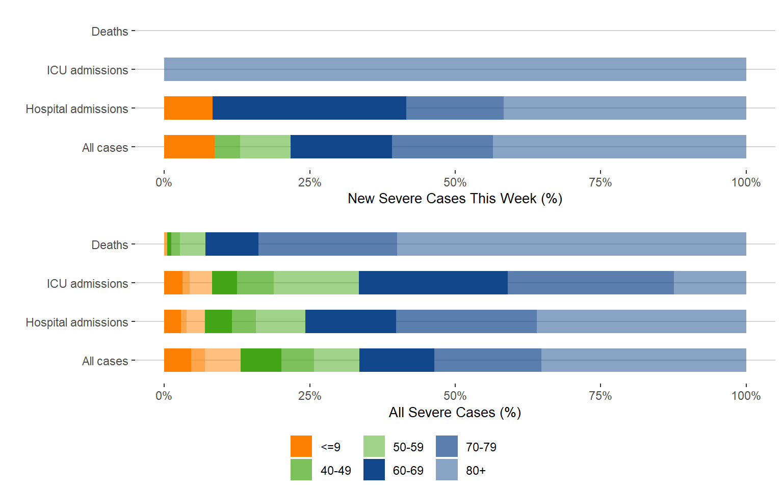 Figure 7. Age Distribution of Severe COVID-19 Cases This Week Compared to All Cases, Manitoba, July 3, 2022 – July 1, 2023