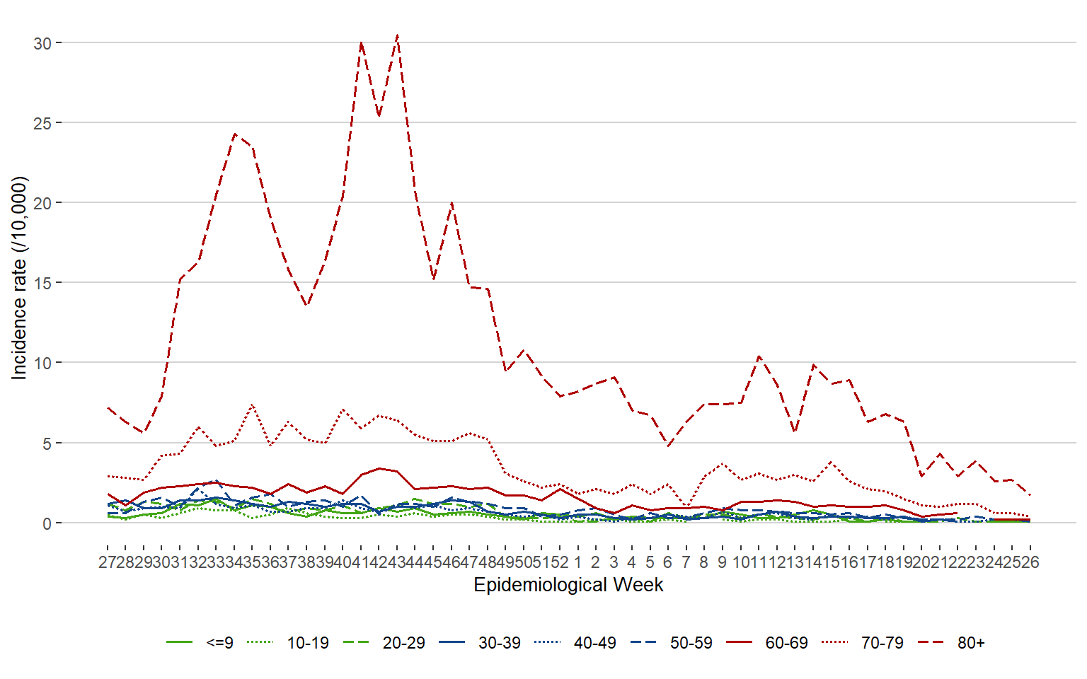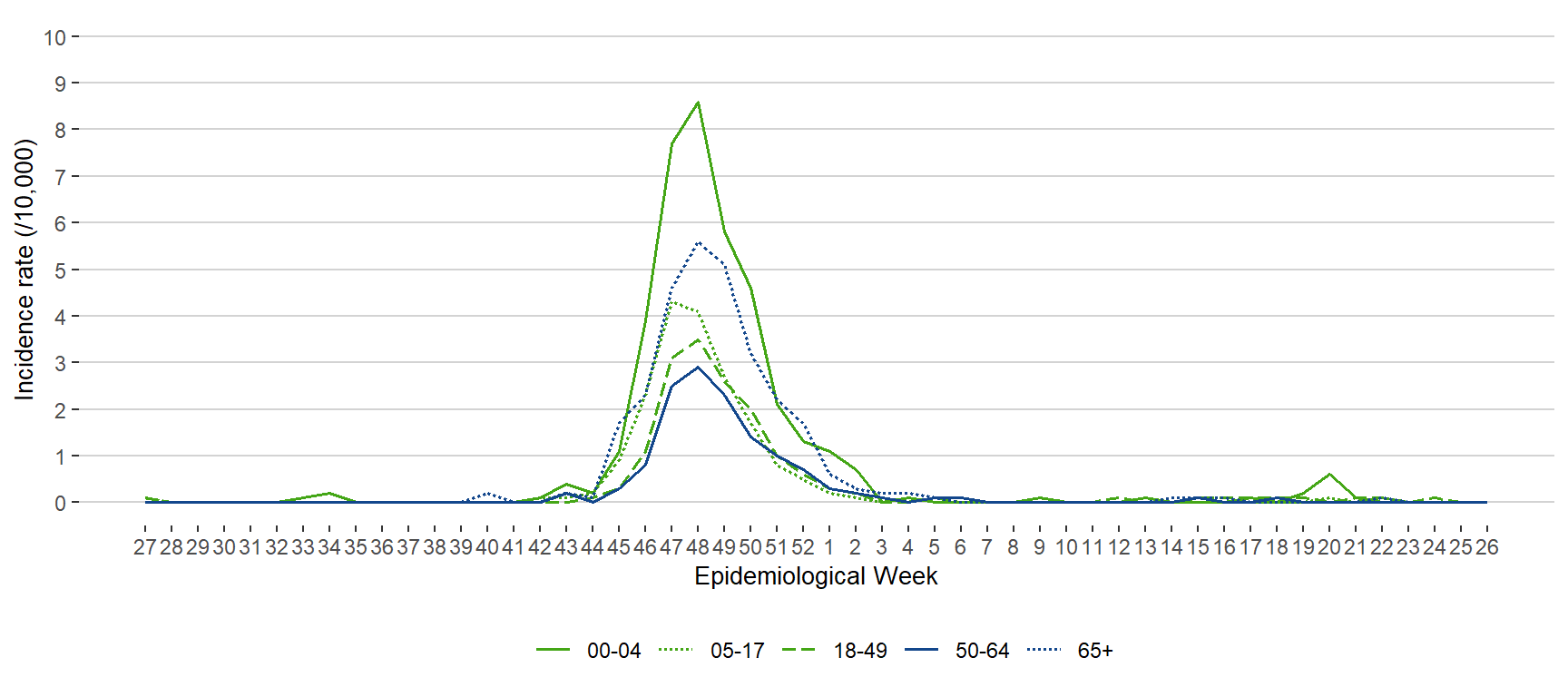 Figure 10. Incidence Rate (/10,000 Population) of Influenza Cases by Age Group and Week of Public Health Report Date, July 3, 2022 – July 1, 2023