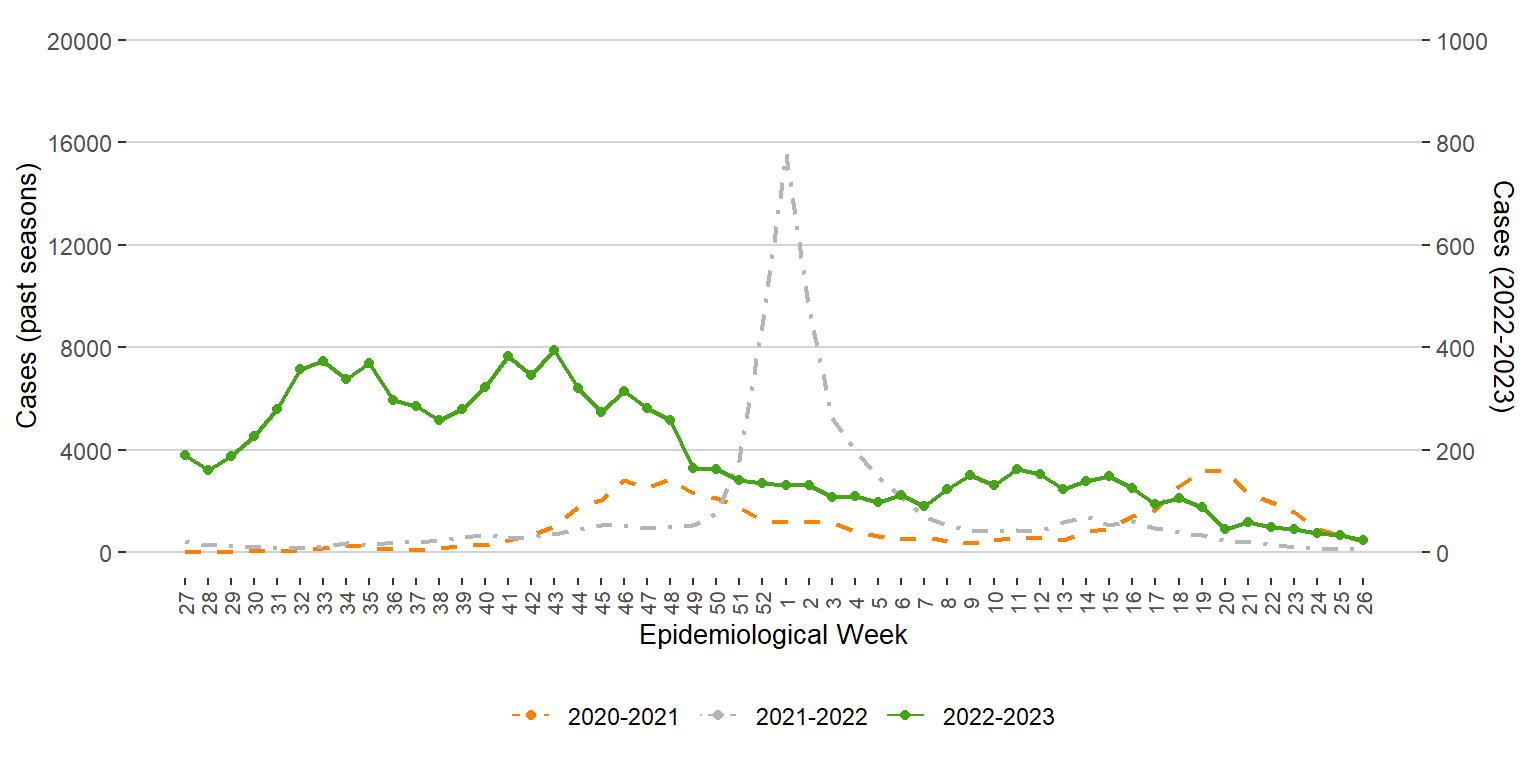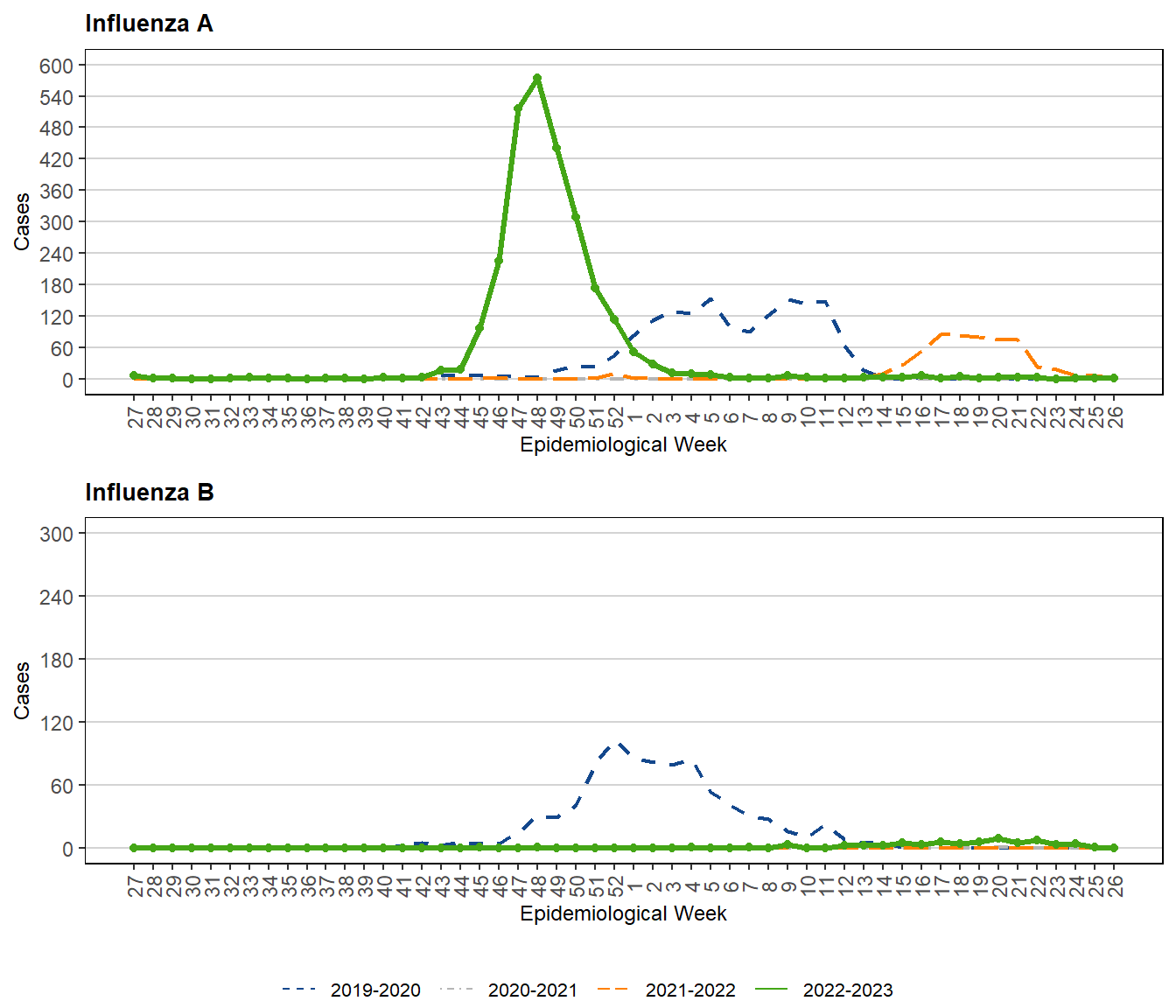 Figure 9. Weekly Cases of Influenza by Season, Manitoba, 2019 – 2023 (July through June)