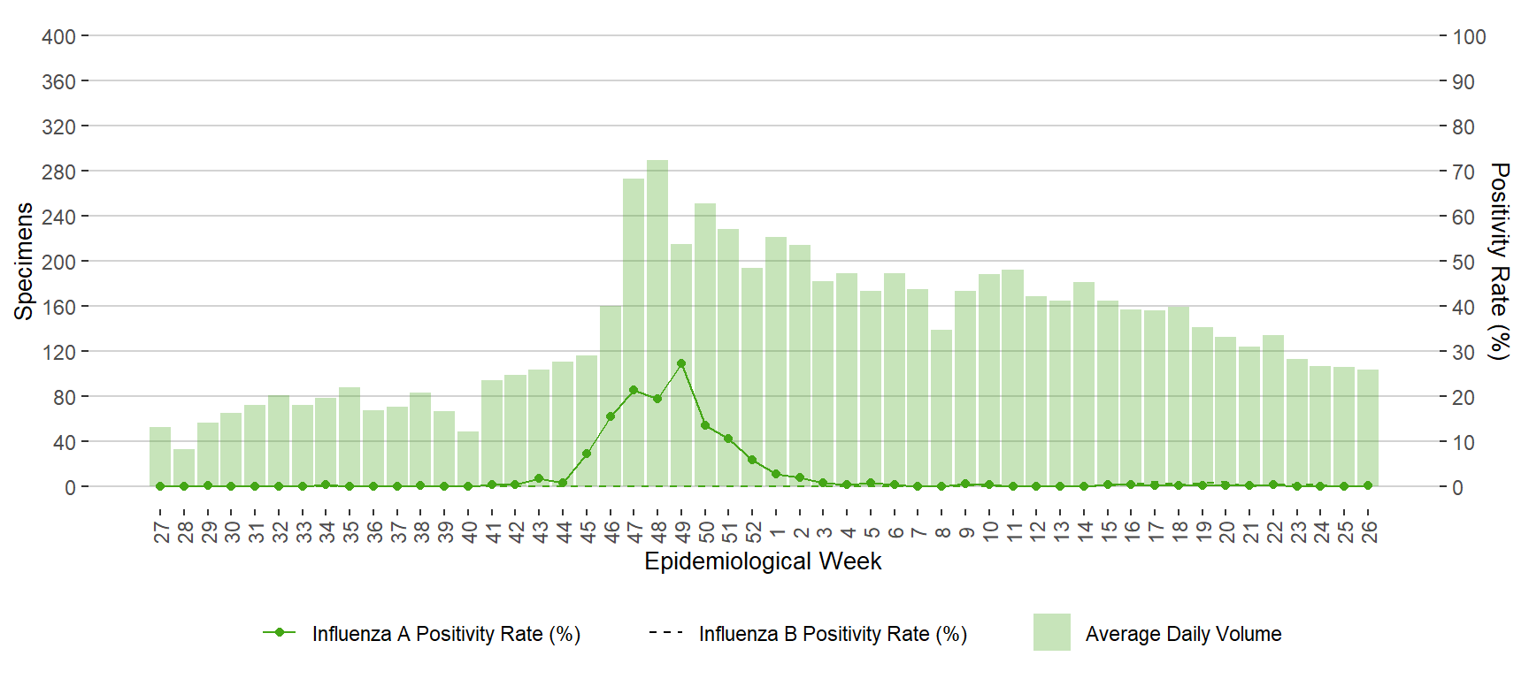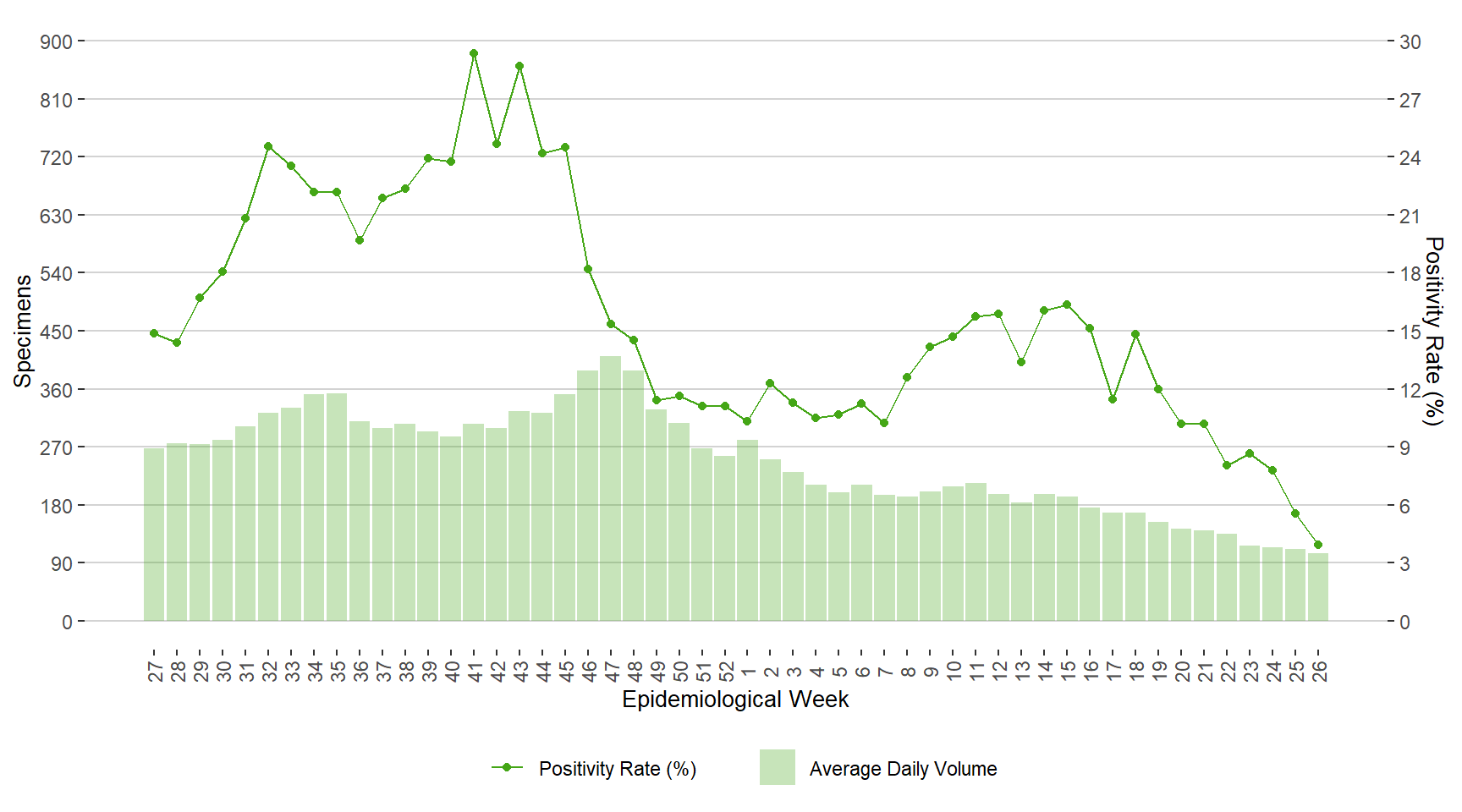 BackFigure 11. Average Daily Testing Volume and Positivity (%) for Influenza by Week of Specimen Receiving Date, Manitoba, July 3, 2022 – July 1, 2023