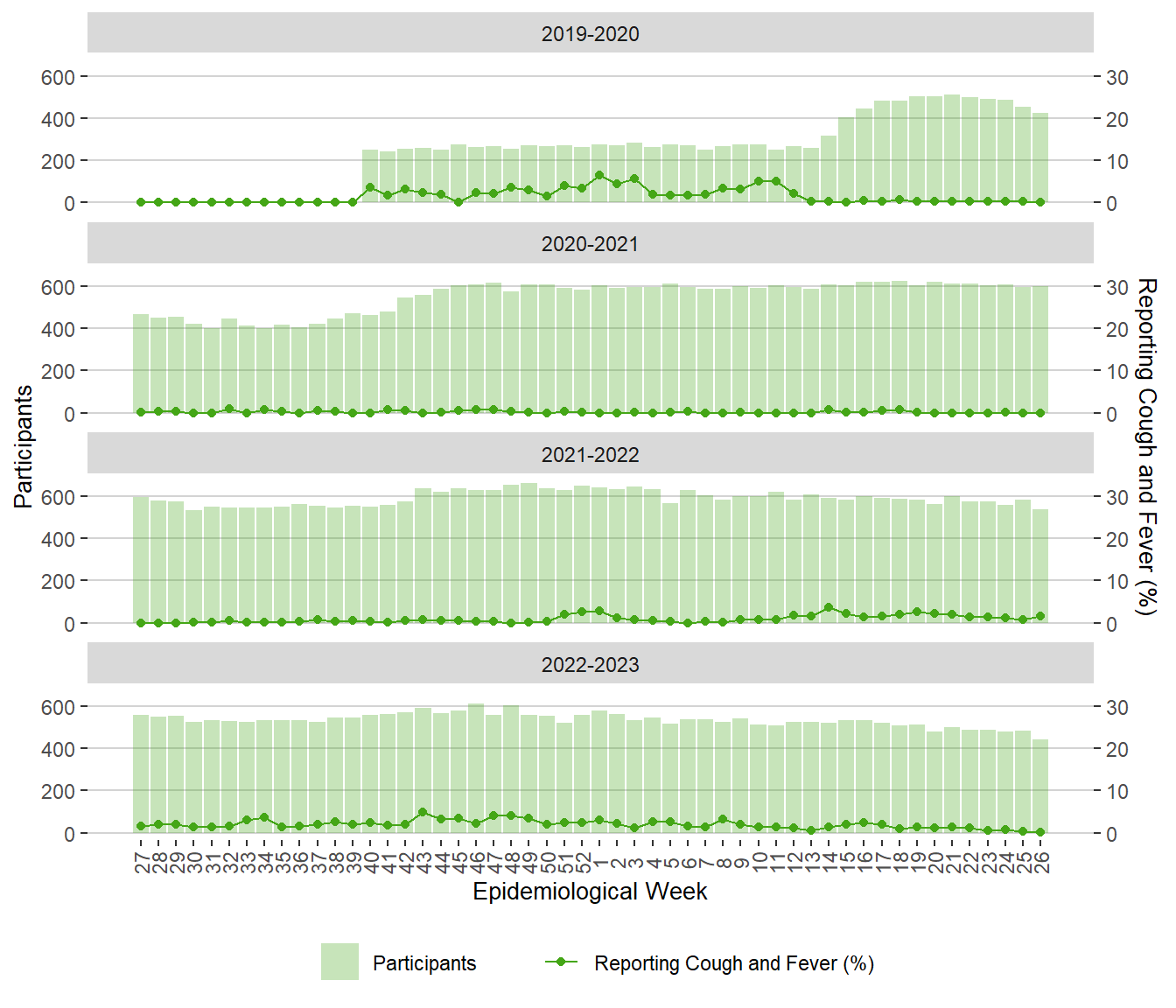 Figure 16. Weekly FluWatchers Participants and Percentage Reporting Fever and Cough, Manitoba, 2019 – July 1, 2023