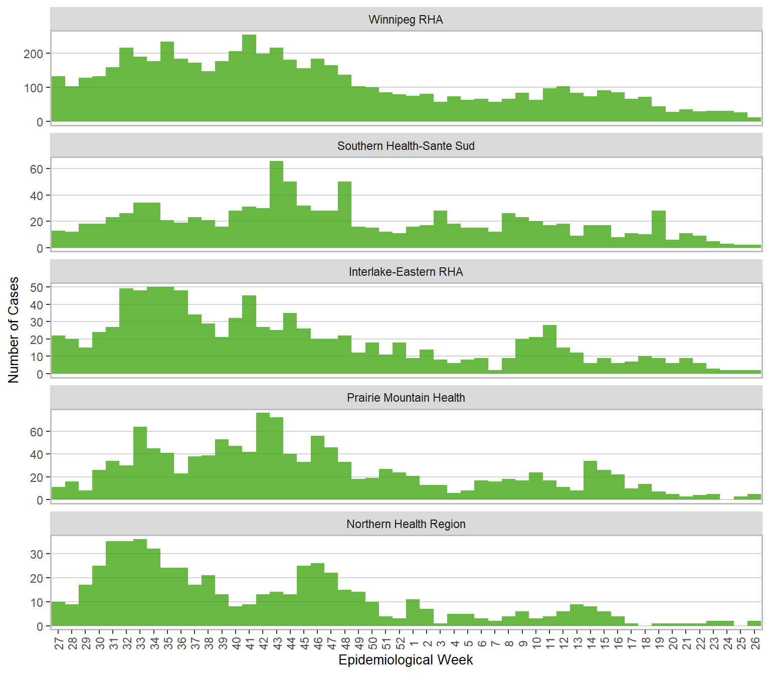 Figure 4. Cases of COVID-19 by Health Region and Public Health Report Date, Manitoba, July 3, 2022 – July 1, 2023