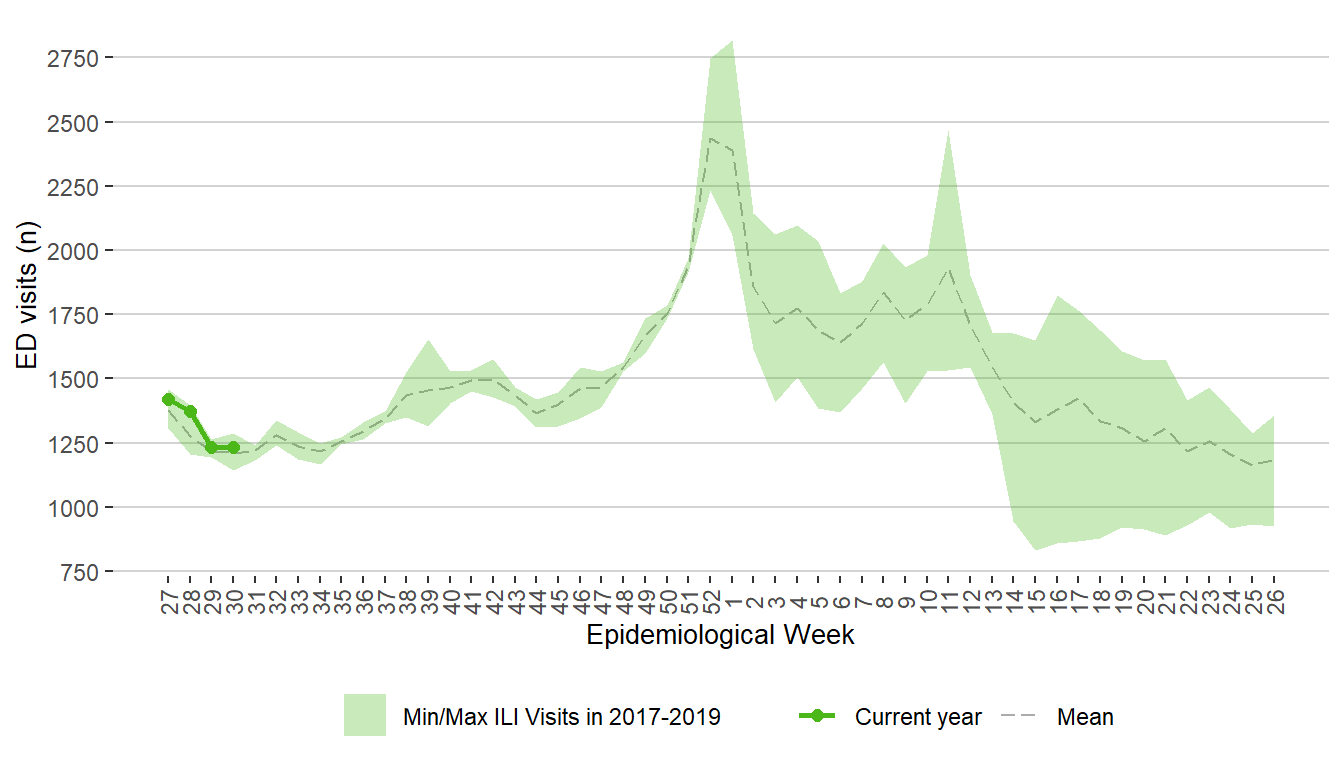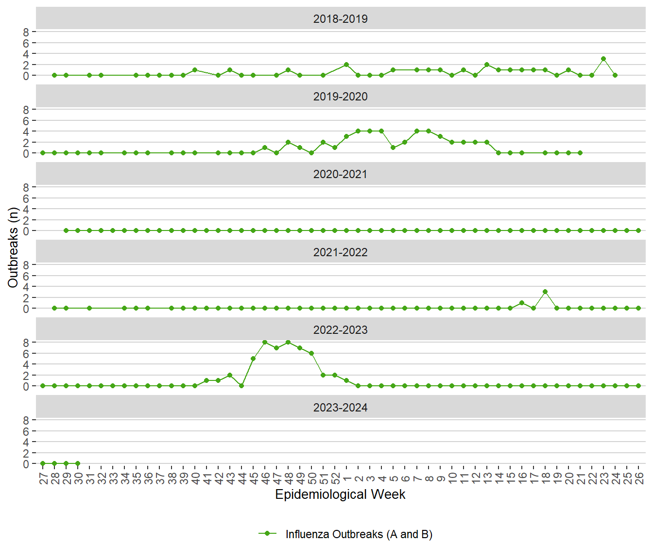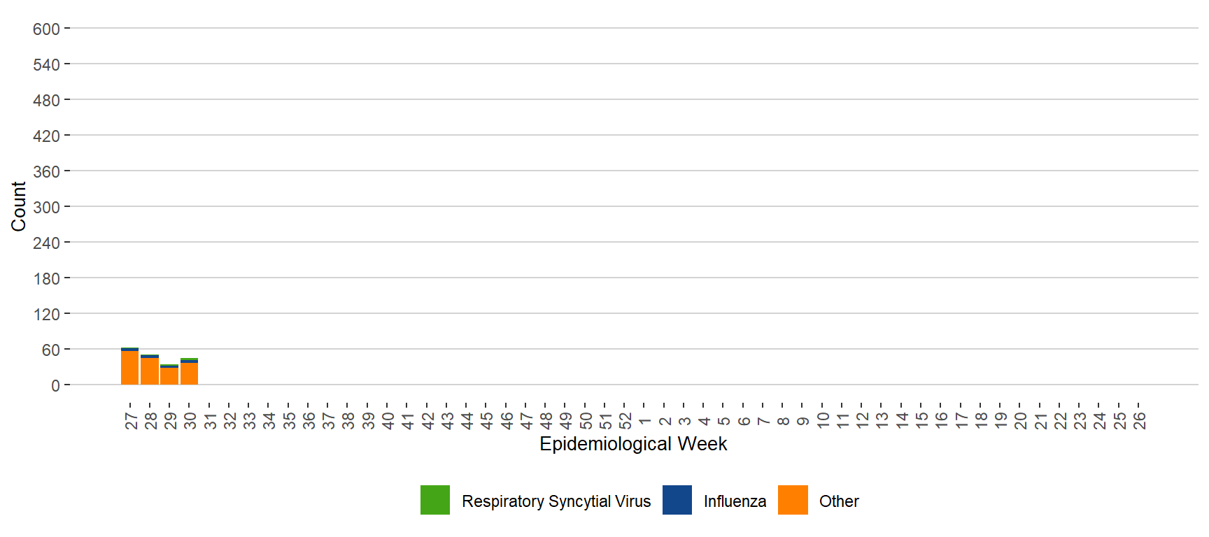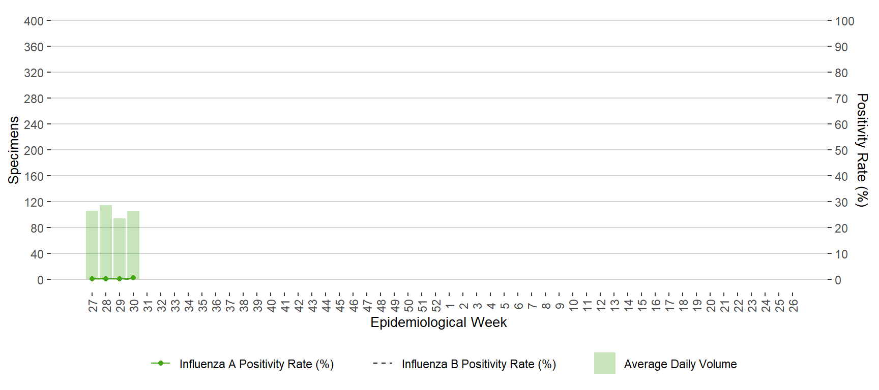 NOTE: We have transitioned into a new season (July 2023-June 2024) for reporting of COVID-19 and influenza. Due to small numbers at the start of this current season, a number of figures and graphs are unavailable.