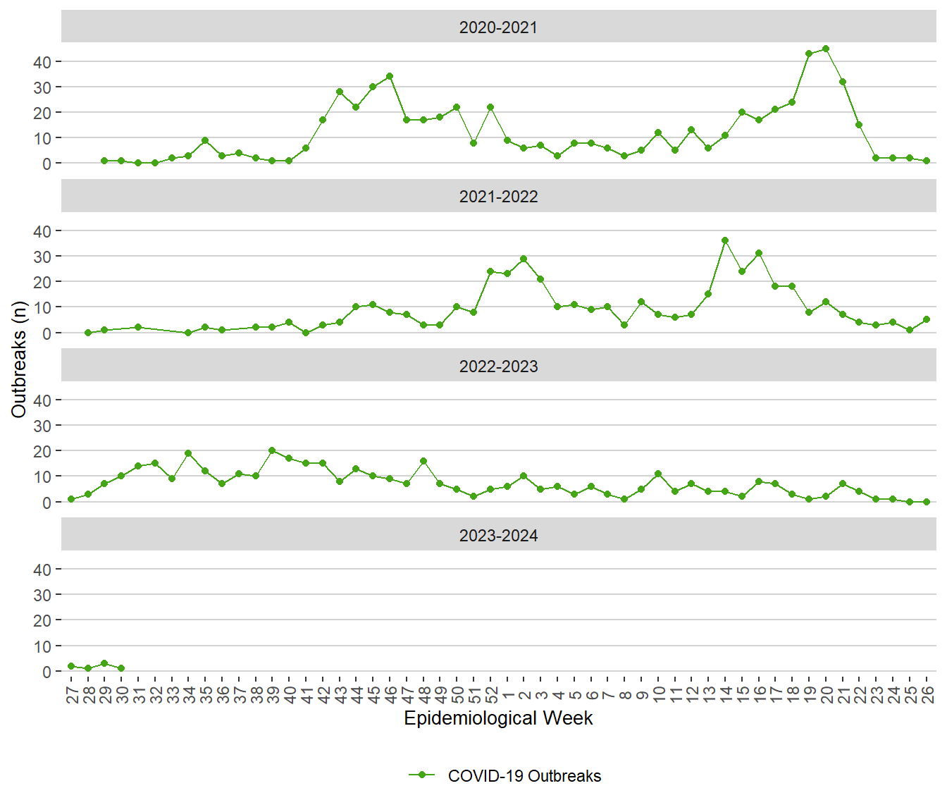 Figure 6. Weekly COVID-19 Outbreaks, Manitoba, 2020 – 2024