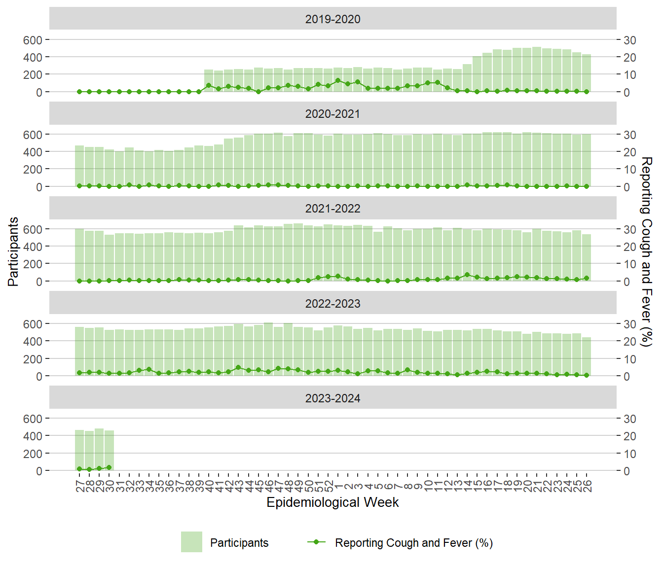 Figure 11. Weekly FluWatchers Participants and Percentage Reporting Fever and Cough, Manitoba, 2019 – July 29, 2023