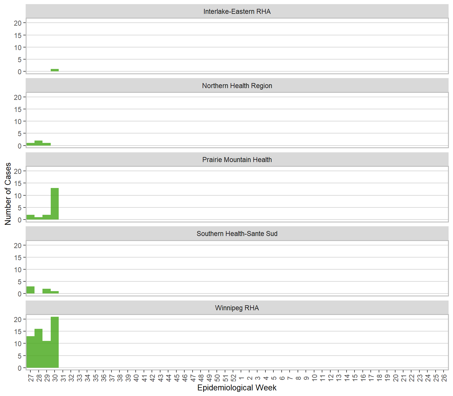 Figure 3. Cases of COVID-19 by Health Region and Public Health Report Date, Manitoba, July 2, 2023 – July 29, 2023