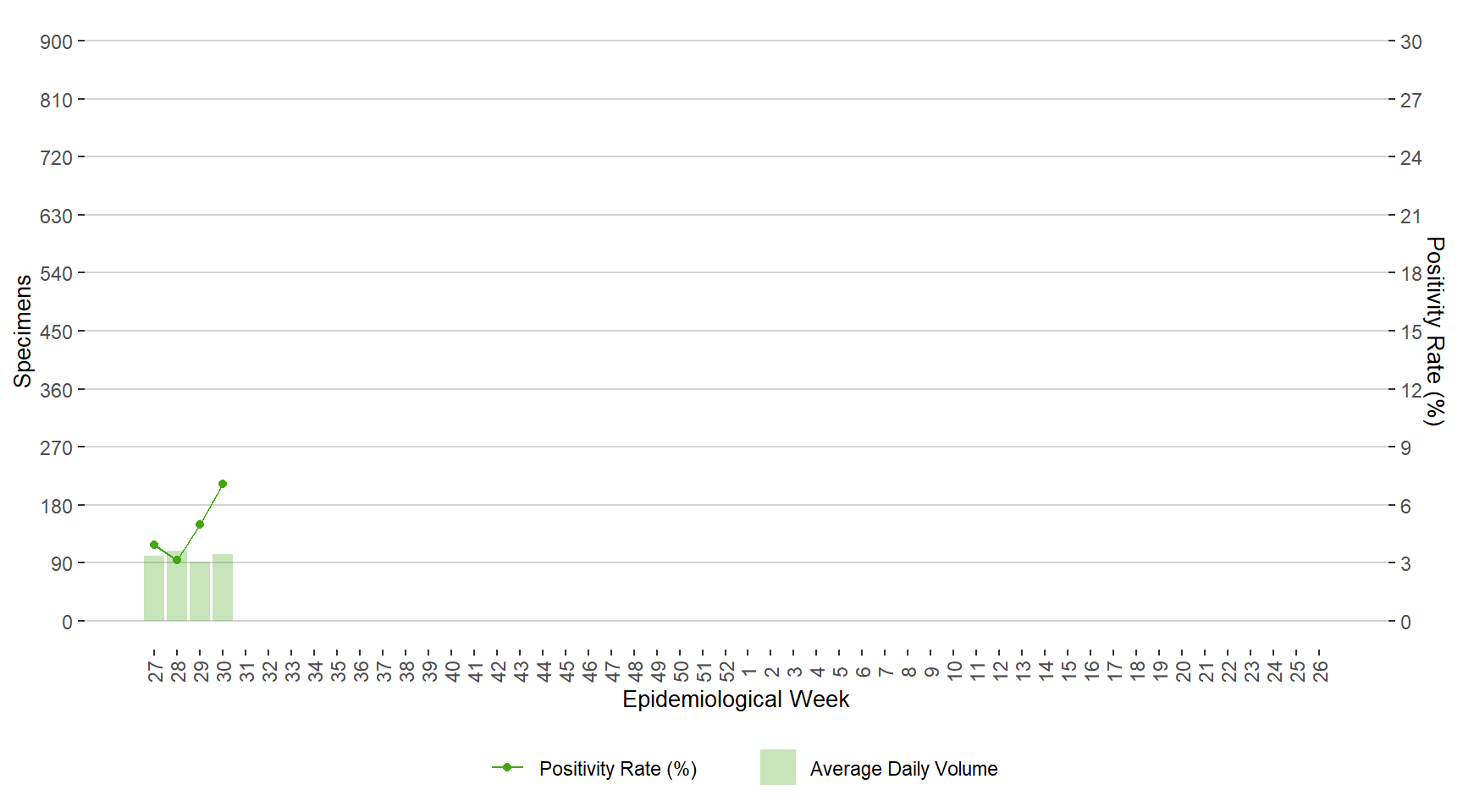 BackFigure 8. Average Daily Testing Volume and Positivity (%) for Influenza by Week of Specimen Receiving Date, Manitoba, July 2, 2023 – July 29, 2023