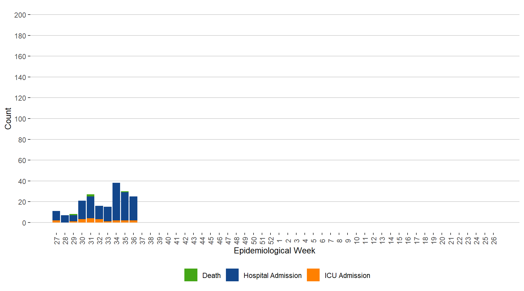 Figure 5. Severe Outcomes of COVID-19 by Week of Outcome Date, Manitoba, July 2, 2023 – September 9, 2023