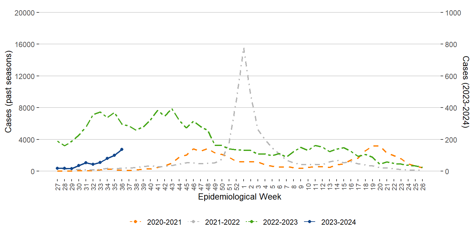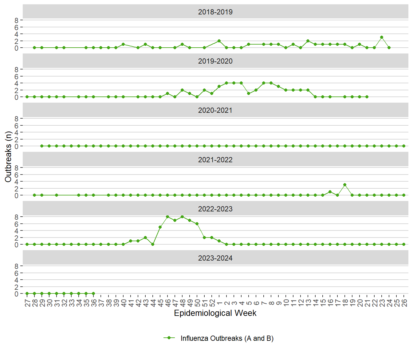 NOTE: We have transitioned into a new season (July 2023-June 2024) for reporting of COVID-19 and influenza. Due to small numbers at the start of this current season, a number of figures and graphs are unavailable.