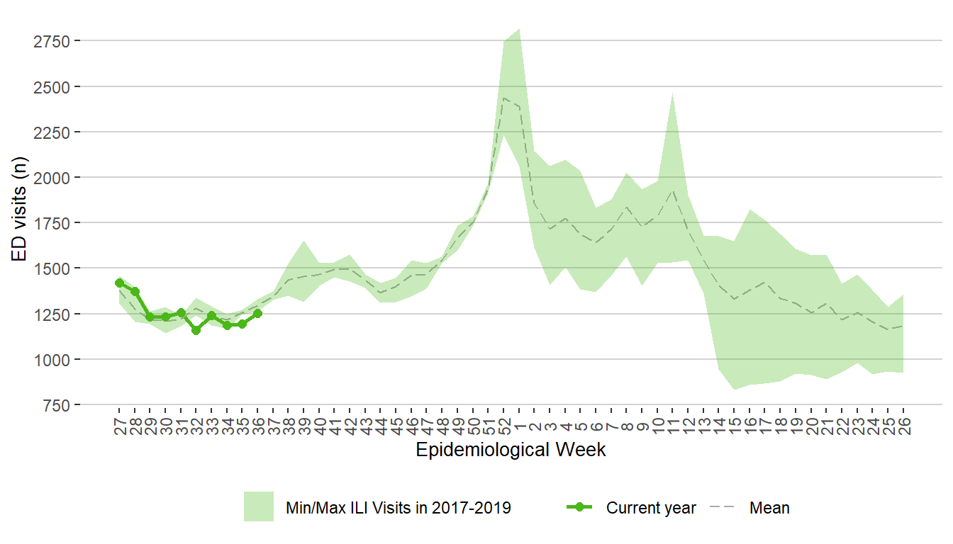 Figure 14. Weekly Respiratory Visits to Emergency Department, Manitoba, 2017 – September 9, 2023
