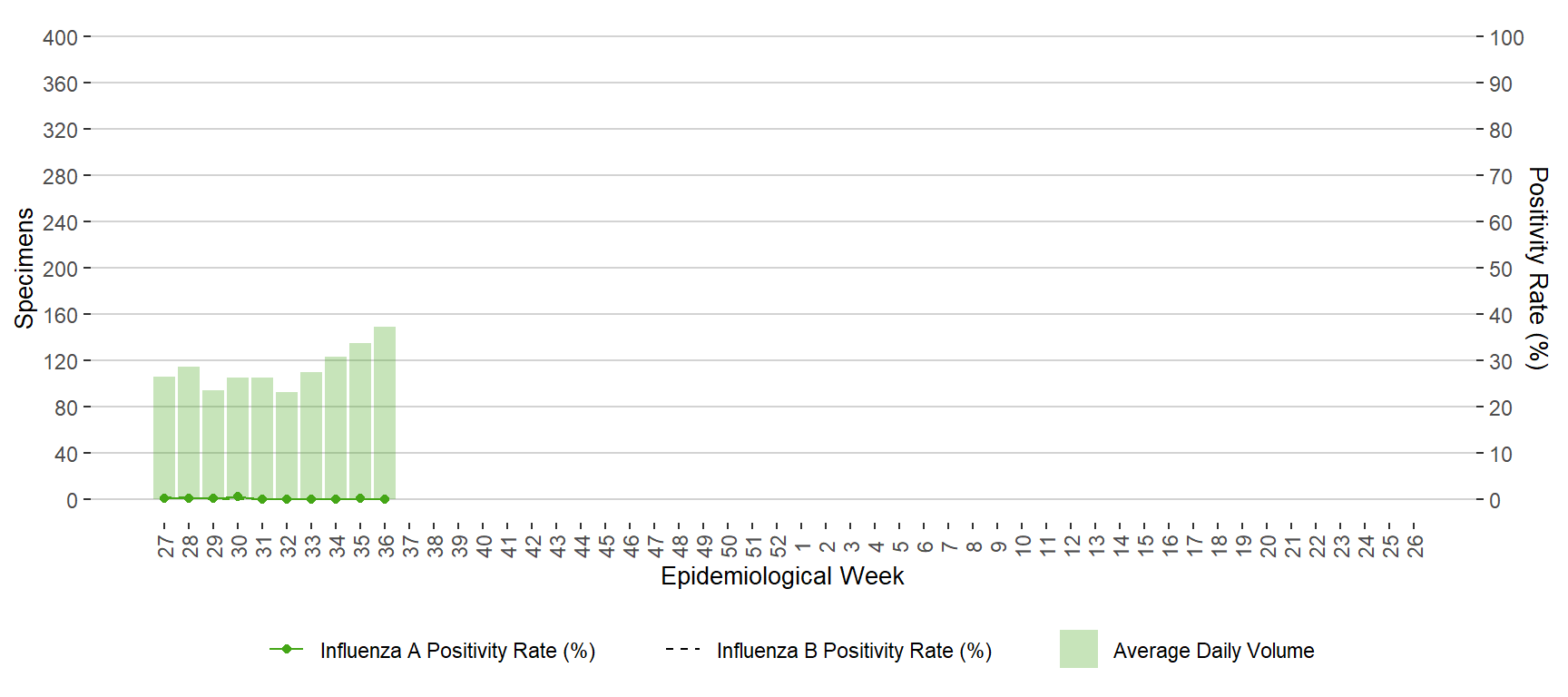 Figure 8. Average Daily Testing Volume and Positivity (%) for Influenza by Week of Specimen Receiving Date, Manitoba, July 2, 2023 – September 9, 2023