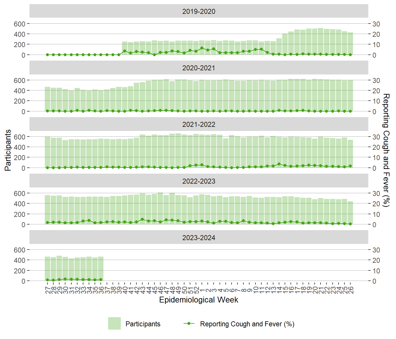 Figure 11. Weekly FluWatchers Participants and Percentage Reporting Fever and Cough, Manitoba, 2019 – September 9, 2023