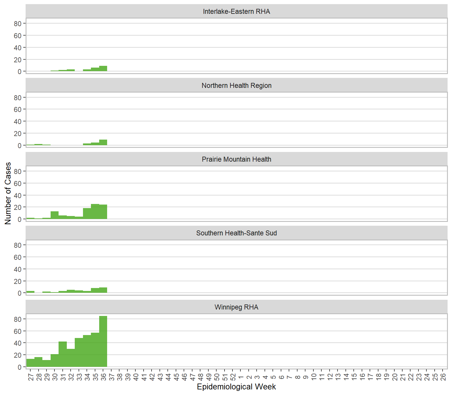 Figure 3. Cases of COVID-19 by Health Region and Public Health Report Date, Manitoba, July 2, 2023 – September 9, 2023