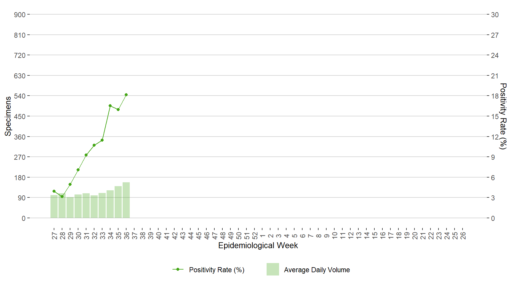 Figure 4. Average Daily Testing Volume and Positivity (%) for COVID-19 by Week of Specimen Receiving Date, Manitoba, July 2, 2023 – September 9, 2023