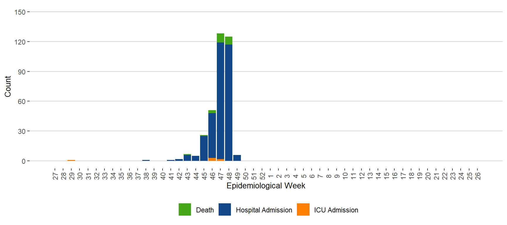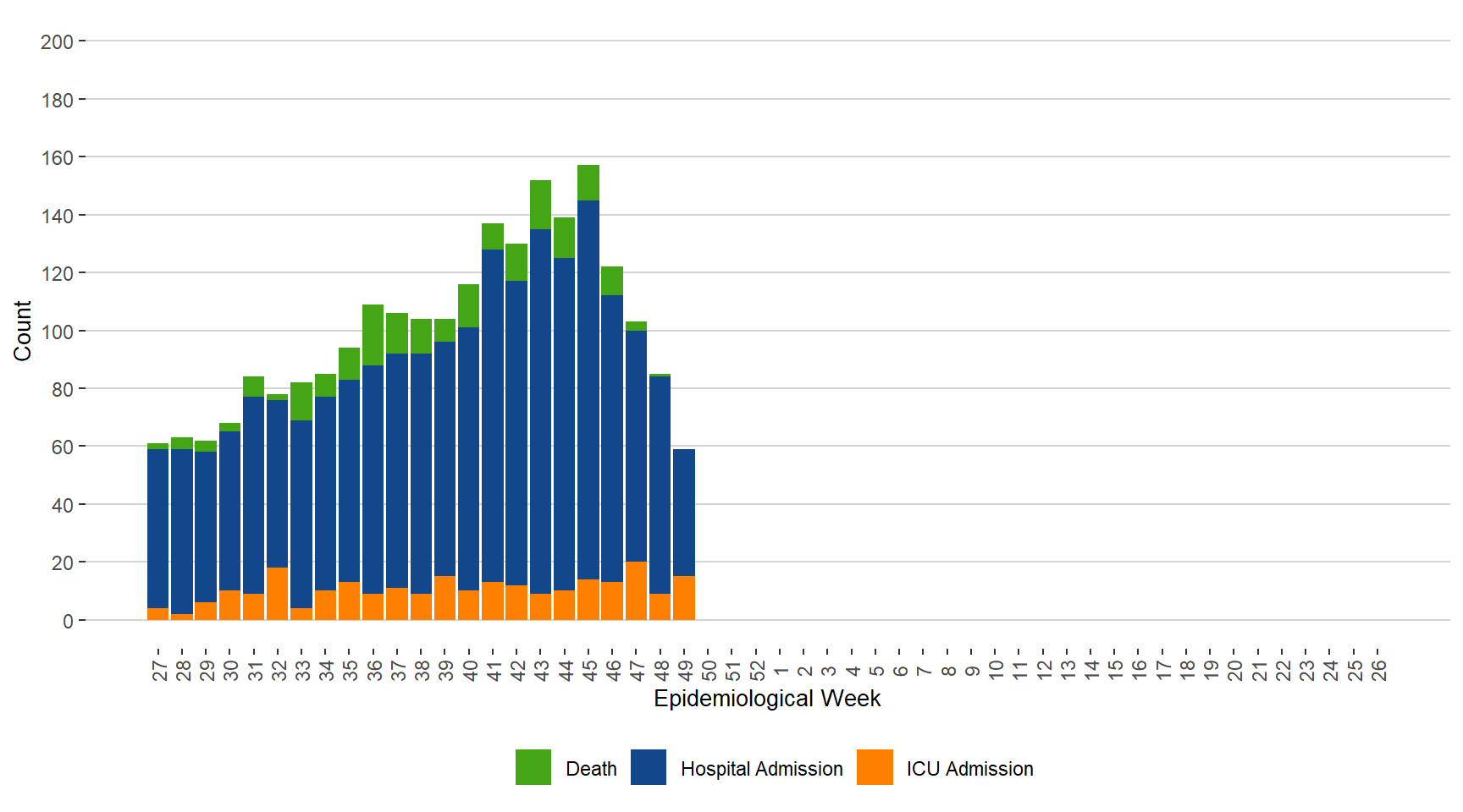 BackFigure 13. Severe Outcomes of Influenza by Week of Outcome Date, Manitoba, July 3, 2022 – December 10, 2022