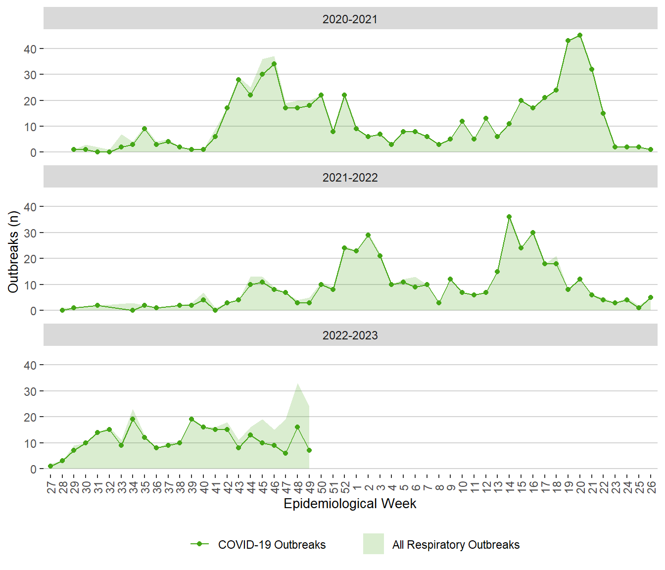 Note: All respiratory outbreaks include COVID-19 outbreaks, influenza outbreaks and the other respiratory outbreaks with known or unknown pathogens.