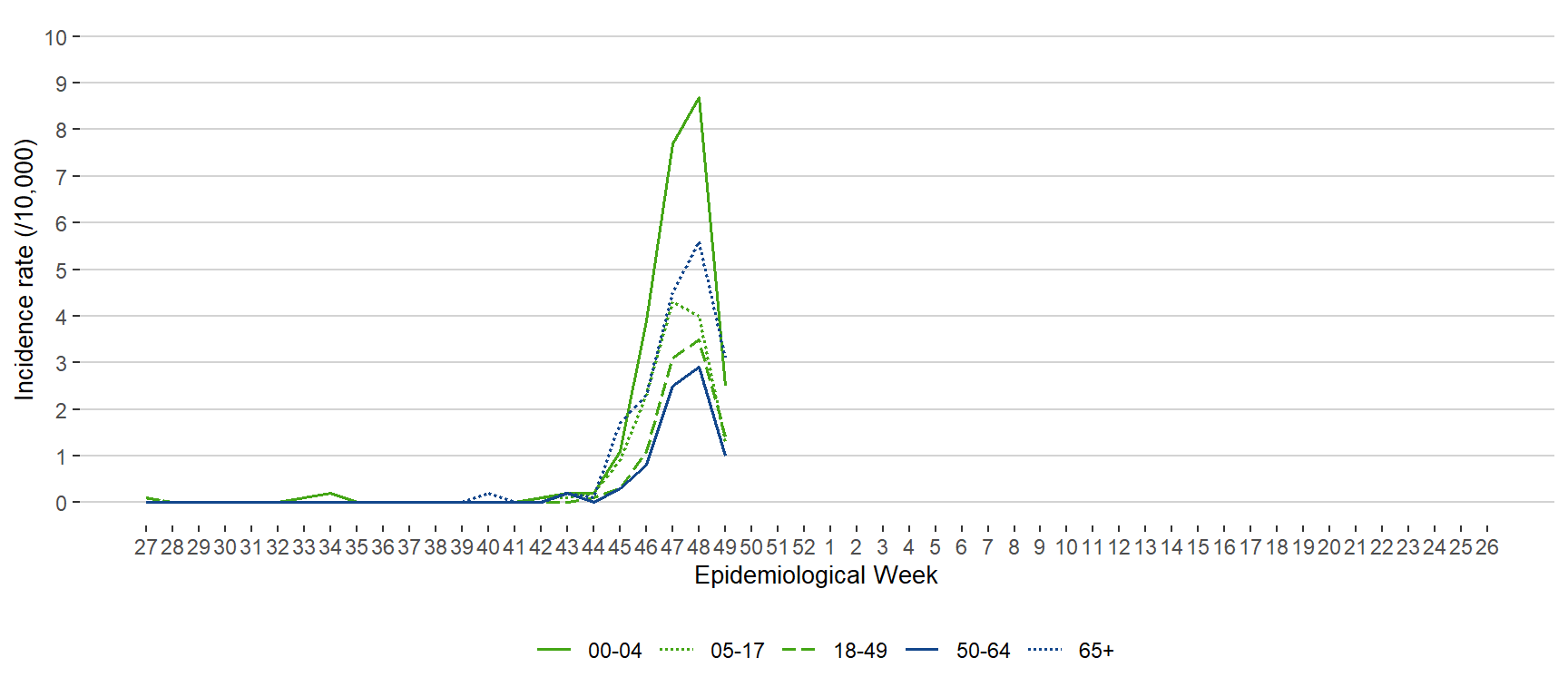 Figure 10. Incidence Rate (/10,000 Population) of Influenza Cases by Age Group and Week of Public Health Report Date, 2018 – December 10, 2022