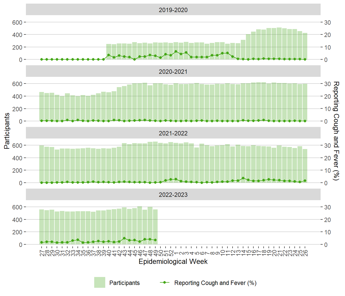 Figure 16. Weekly FluWatchers Participants and Percentage Reporting Fever and Cough, Manitoba, 2019 – December 10, 2022