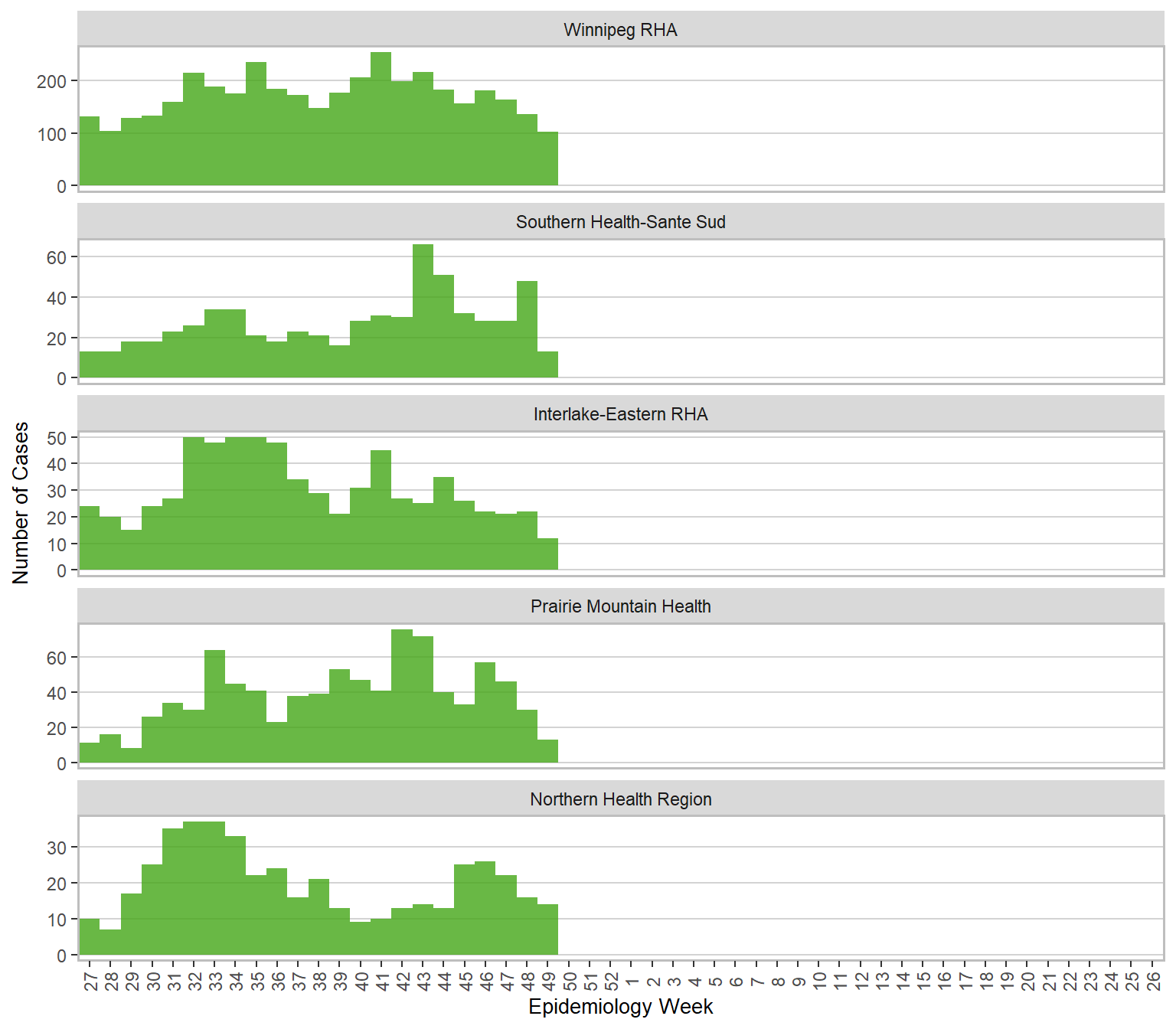 Due to an influx of influenza laboratory reports this respiratory season, Manitoba Health is experiencing delays in the documentation of laboratory results within the provincial Public Health Information Management System (PHIMS). As s result, the influenza case counts for week 49 are lower than expected. We anticipate an update to these data in next week’s report.